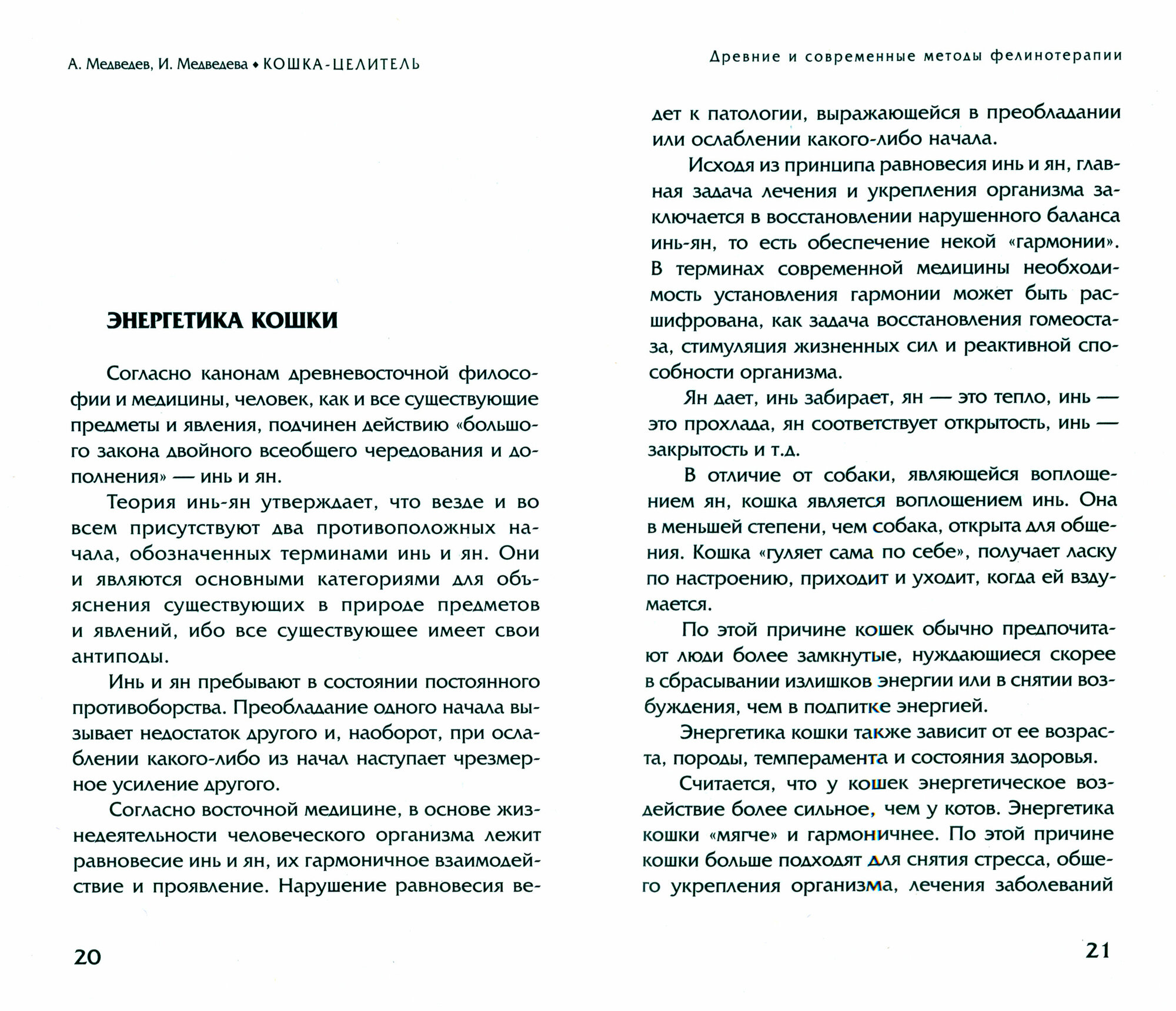 История отношений кошки, собаки и человека насчитывает несколько тысячелетий. Кошки и собаки — это не только милые домашние питомцы, но ещё и животные-целители. В книге известных российских писателей и психологов Александра и Ирины Медведевых «Животные — домашние целители. Методы и техники лечения болезней» подробно рассказано о том, как человек может использовать кошек и собак для того, чтобы избавиться от многих болезней, а также обрести хорошее настроение и самочувствие. Издание предназначено для всех, кто интересуется нетрадиционной медициной.