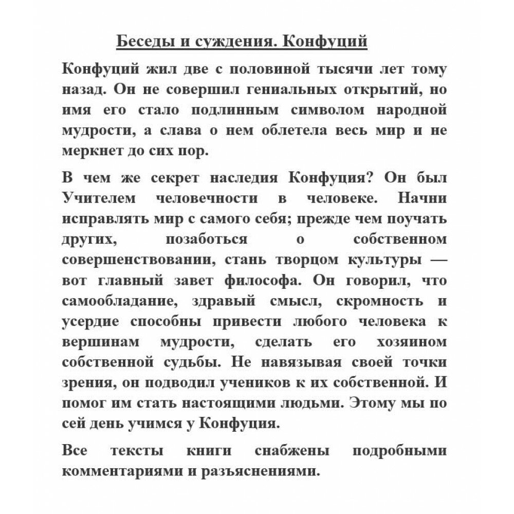 К тексту Конфуция претензий нет, а вот комментаторов хочется прокомментировать. Если толкование Конфуция В. Малявиным только запутывает читателя и отталкивает от дальнейшего изучения, то графомания Е. Ямбурга откровенно бесит. Его комментарии заключаются в наивной попытке перенести мысли Конфуция на современность. Идея хорошая, но сделано.... Ямбург вырывает фразы из контекста, приплетает ложные смыслы и без стеснения поливает грязью Советский союз. Все его комментарии сводятся к одному: СССР – ад. Примерно то же говорил и небезызвестный Гиммлер. Так что лучше возьмите другую книгу.