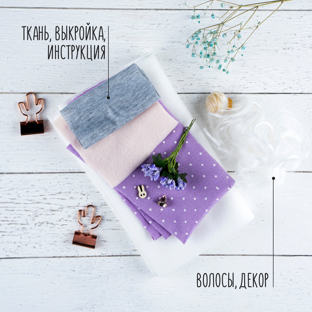 В наборе: ткань, выкройки, волосы-трессы, декор, инструкция.