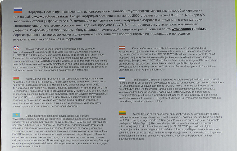| Дополнительная информация | лазерные картриджи Cactus необходимо хранить в сухом защищённом от влаги месте при температуре от + 5 до +35°С и влажности воздуха не более 60%. Хранить в темном месте в коробке и запаянном пакете, во избежание засветки фотовала. |