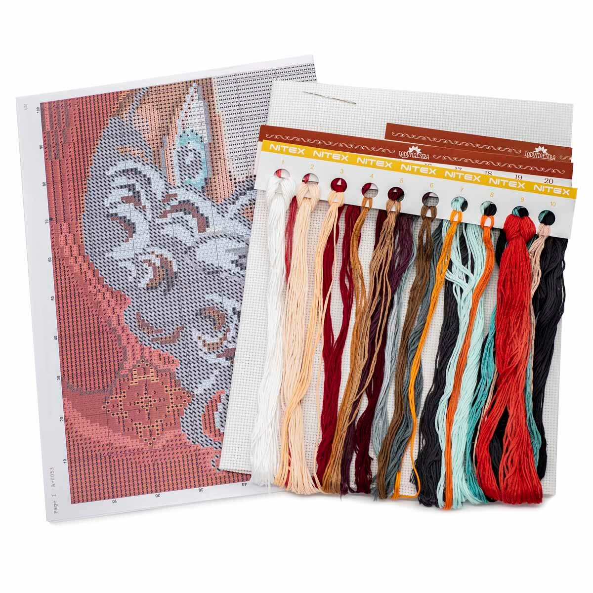 В наборе: канва Aida 14 белая, нитки мулине ПНК им. Кирова, игла, цветная схема, инструкция.