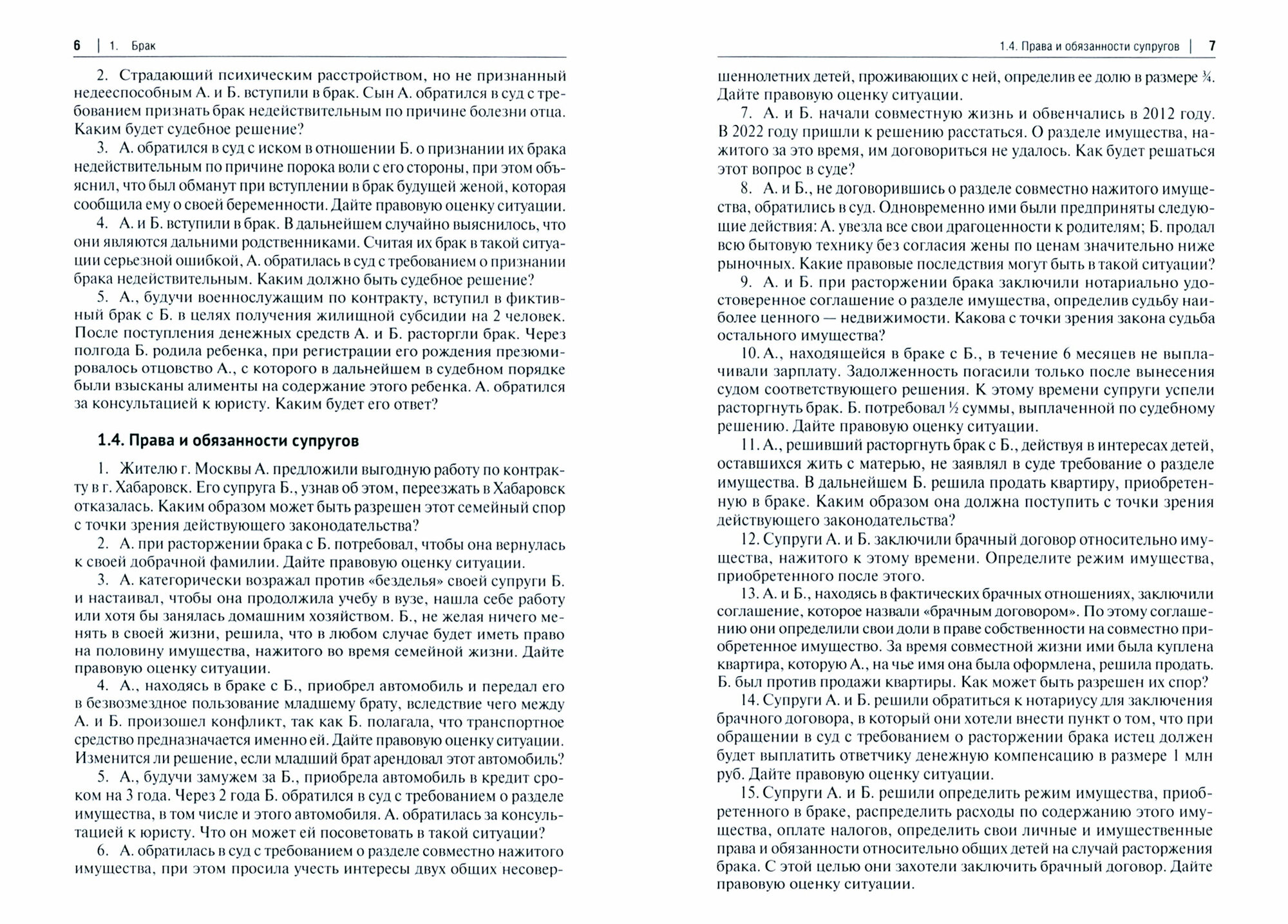 Автор предлагает задачи по семейному праву, решение которых в рамках практических занятий по дисциплинам, связанным с семейным правом, позволит обучающимся (бакалавриат, специалитет и магистратура) усвоить материал по темам, связанным с заключением и расторжением брака, признанием его недействительным; личными и имущественными правами и обязанностями супругов; установлением происхождения детей; правами и обязанностями родителей и детей; семейно-правовой ответственностью; алиментными обязательствами; устройством детей, оставшихся без попечения родителей.