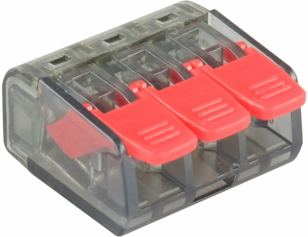Предназначены для соединения одножильных и многожильных медных проводов, защищая их от повреждения и исключая возможность замыкания. Рычажки предназначены для надежного зажима кабелей. Используется в цепях переменного и постоянного тока до 450 В. Прозрачный корпус позволяет отследить качество соединения.
