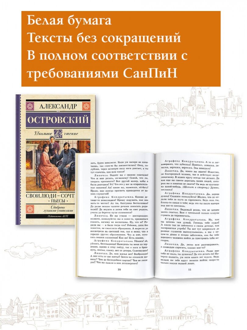Данную книгу приобрела для моего ребёнка. В школе они проходят творчество Александра Николаевича Островского. Мне очень понравилась данная серия. Приемлемая ценовая категория. качество страниц, размер шрифта, компактность самой книги. В данном издательстве нет иллюстраций, но их отсутствие книгу не портит. Теперь мы обязательно будем собирать внеклассное чтение в этом оформлении.