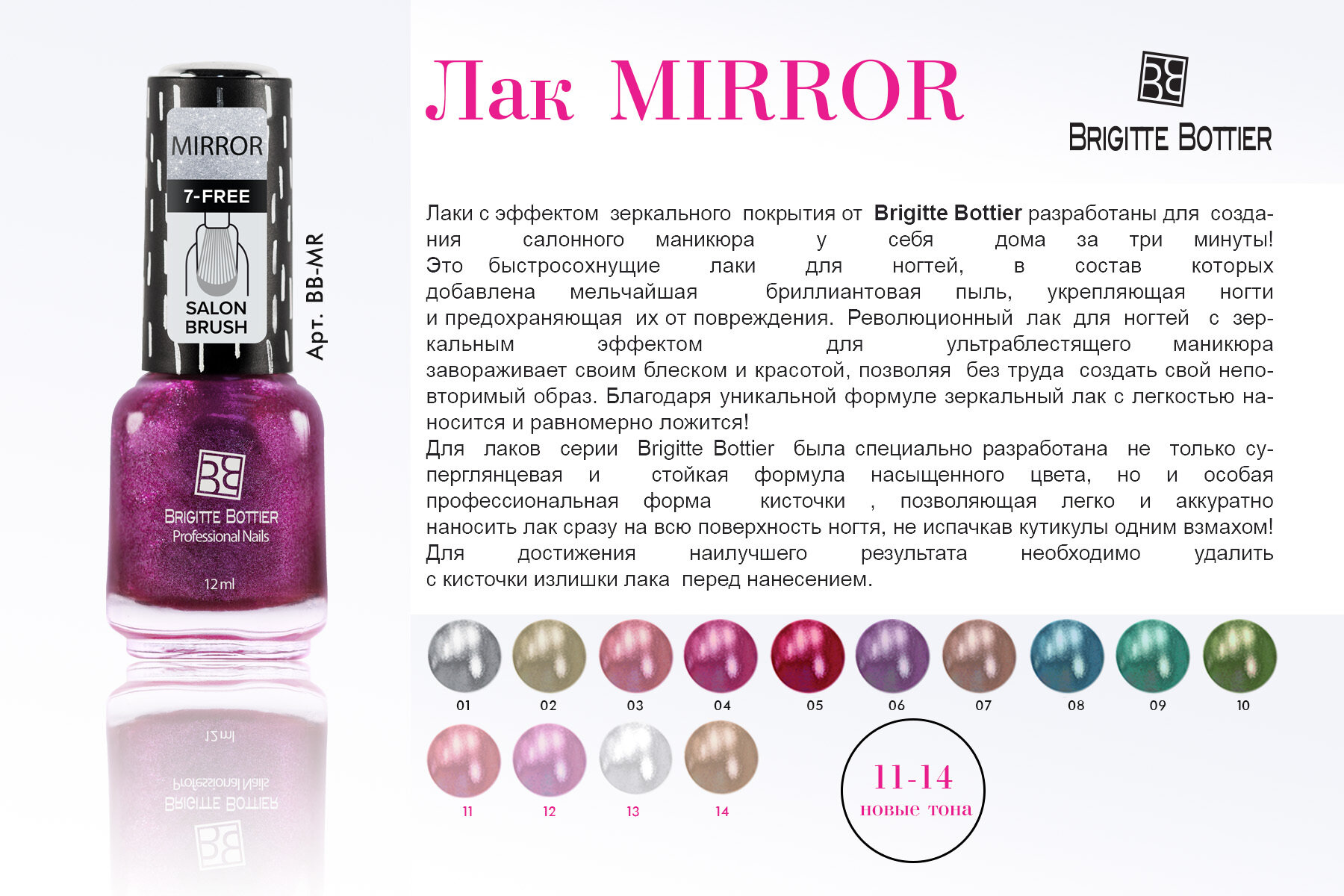 Революционный лак для ногтей с зеркальным эффектом для ультраблестящего маникюра завораживает своим блеском и красотой, позволяя без труда создать свой неповторимый образ. Благодаря уникальной формуле, зеркальный лак с легкостью наносится и равномерно ложится ! Особая профессиональная форма кисточки позволяет легко и aккуратно наносить лак сразу на всю поверхность ногтя не испачкав кутикулы.