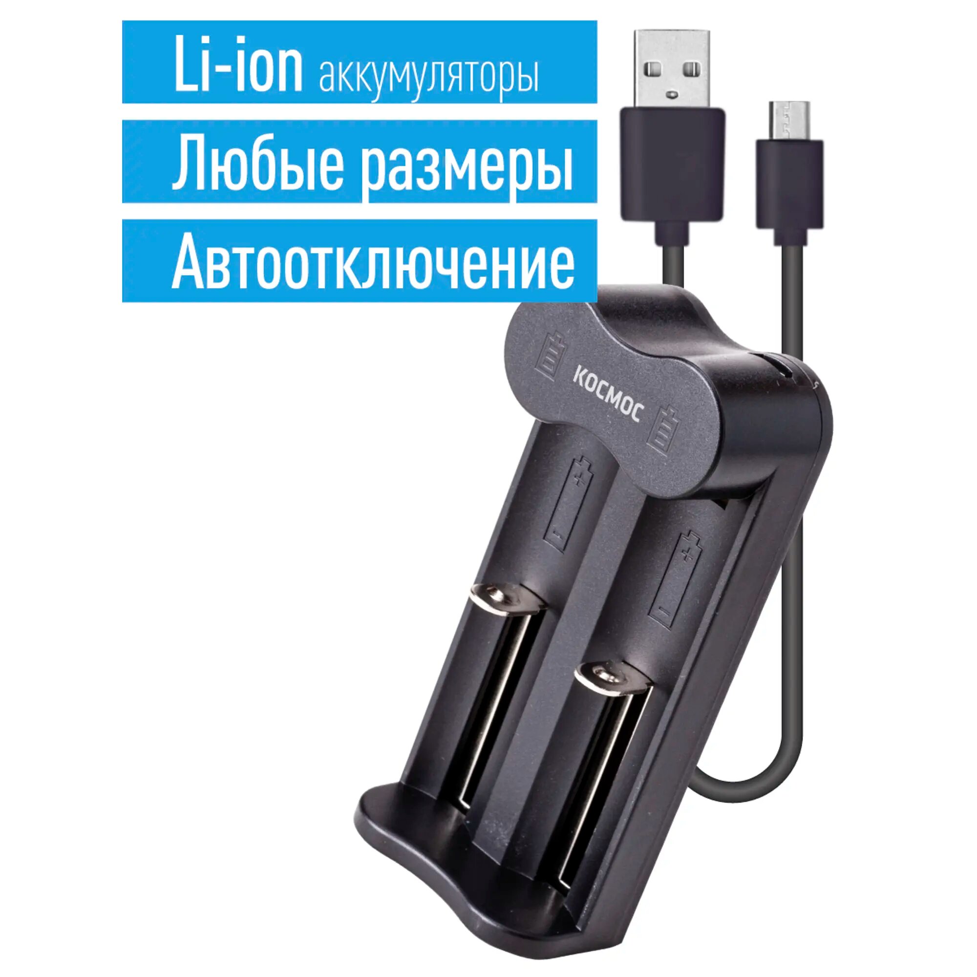 Космос Зарядное устройство Зарядное устройство для Li-Ion аккумуляторов питание от USB шнур. Умное зарядное устройство с Автоотключением. Время заряда зависит от ёмкости аккумулятора. Раздвижные слоты совместимы с любыми типоразмерами цилиндрических литий-ионных аккумуляторов, которые часто используются в фонарях или вейп-испарителях. Заряжает 1-2 шт. 16340/17335/18490/18650/20700. Слим-Дизайн: удобно класть в сумку для ноутбука. Не занимает розетку, легко подключить к ноутбуку или к адаптеру зарядки телефона.