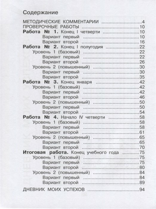 Каждая из работ предлагается в двух вариантах. Вторая и следующие работы содержат задания первого (базового) и второго (повышенного) уровней. Проверочная работа по итогам освоения математики в 1-м классе также включает два уровня, в каждом из которых 2 варианта.