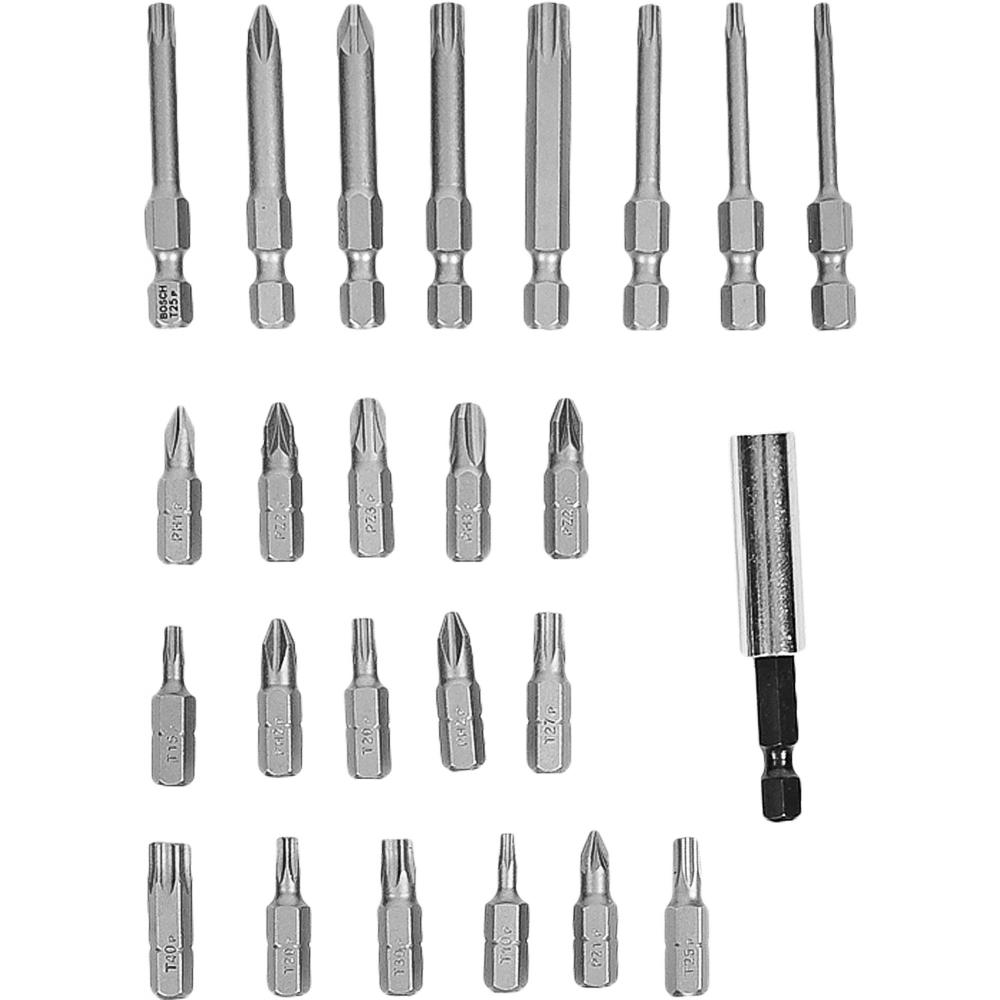 16 бит длиной 25 мм с головками: PH1, PH2 × 2, PH3, PZ1, PZ2 × 2, PZ3, T10, T15, T20 × 2, T25, T27, T30, T40;