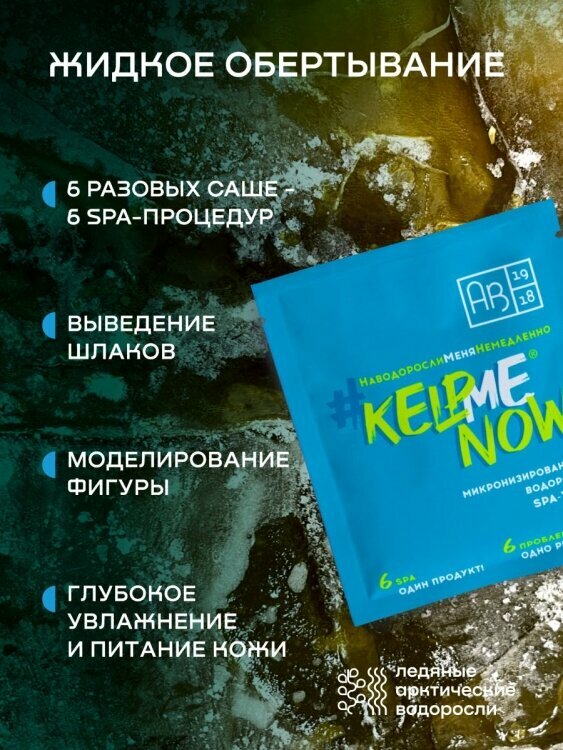 Микронизированные водоросли SPA-УХОД #KELPMENOW представлены в виде порошка из сухих водорослей с добавлением водорослевых субстанций АВ1918. Расфасованы в одноразовые саше по 50г (6 саше в одной коробке). Одно саше – одна SPA-процедура на выбор: тонизирование водорослевым льдом, маска для лица и зоны декольте, обертывание проблемных зон, SPA-ванна тонизирующая, SPA-ванна релаксирующая, жидкое термообертывание.