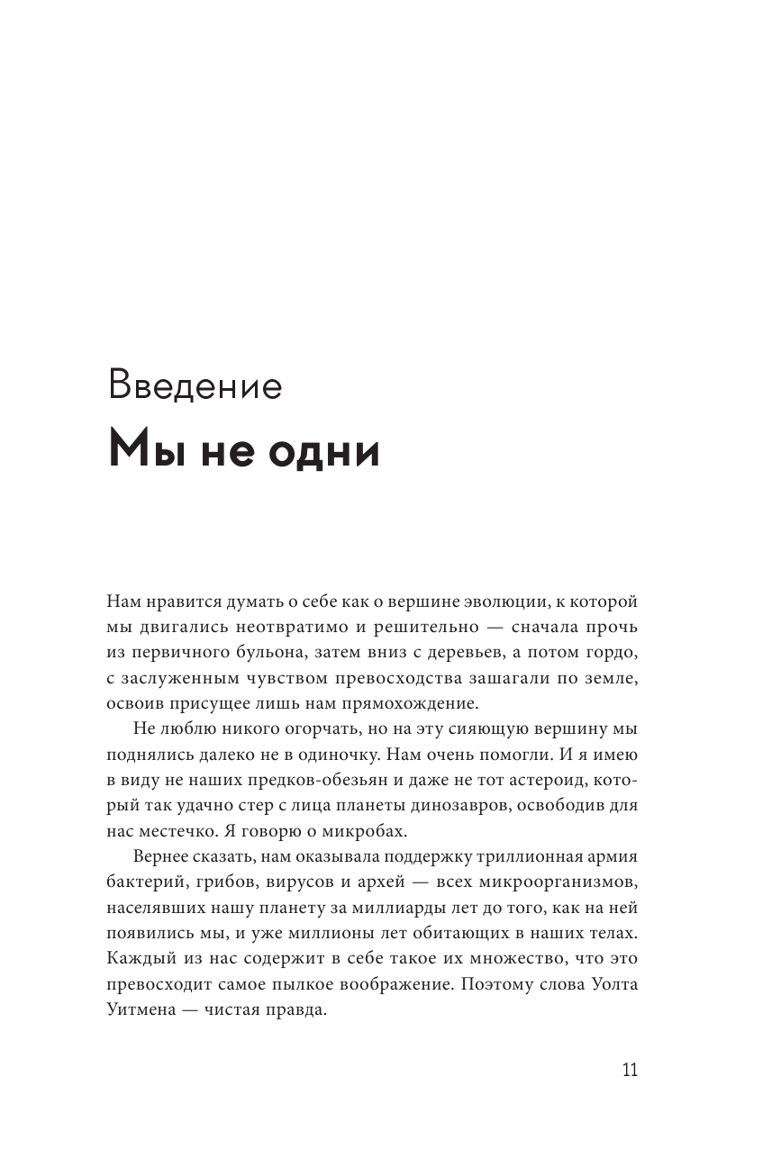 поднялись далеко не в одиночку. Нам очень помогли. И я говорю о микробах. Каждый из нас содержит в себе такое их множество, что это превосходит самое пылкое воображение. Но мы не просто вмещаем в себе эти неисчислимые множества — мы еще и зависим от них. Не будь их, мы никогда не приобрели бы такую совершенную иммунную систему, не научились бы извлекать из пищи самые разные необходимые нам для нормального существования питательные вещества, да и в целом наши тела были бы пристанищем всяческих болезнетворных микроорганизмов, гостеприимно распахнутым для них как снаружи, так и изнутри. Короче говоря, мы в отсутствие микробов были бы скорее мертвы, чем живы.