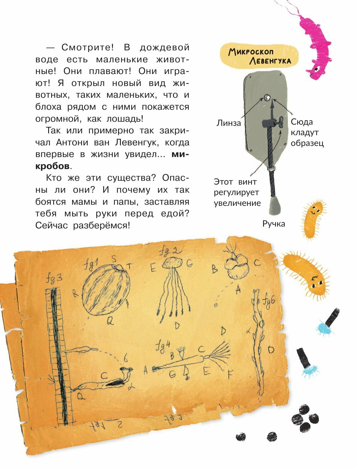 Понравился и крупный шрифт, и великое множество иллюстраций с подписями и без. Увидели разные виды бактерий: безъядерные и с ядром, узнали, какие бактерии полезные и помогают очищать почву и воду, а какие могут вызвать болезни.