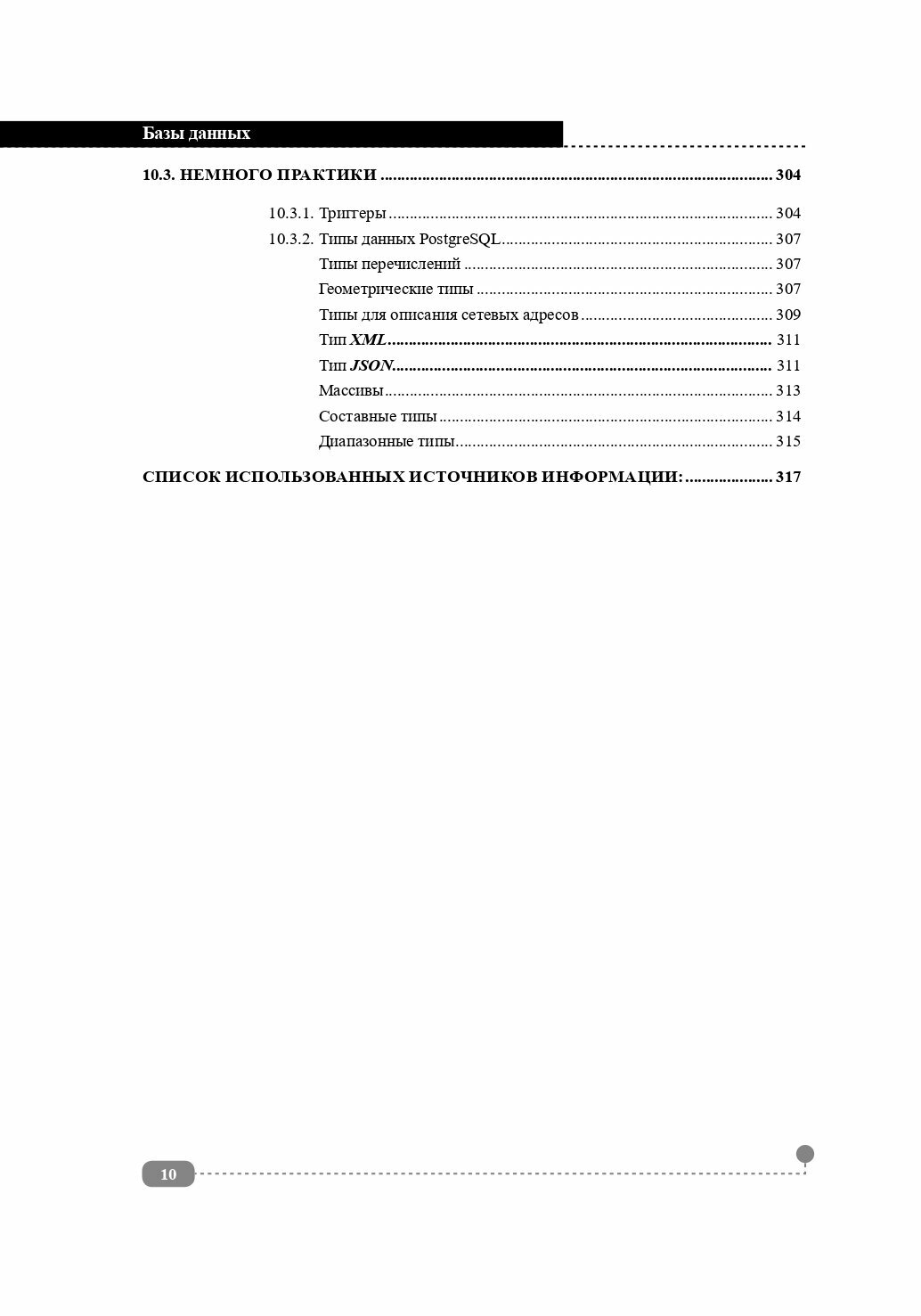 В этой книге рассматриваются только реляционные базы данных. Мы постарались собрать в одной книге множество самых различных тем для работы с базами данных: вы узнаете об устройстве баз данных; проектировании, индексах и транзакциях в работе с БД; о синтаксисе SQL (вместе со множеством примеров), а также PL/SQL; поговорим об определении прав доступа к данным и многом другом. Отдельное внимание уделено практическим особенностям и реализации наиболее распространенных реляционных СУБД: MySQL, Oracle и PostgreSQL. Книга рассчитана на начинающих и уже состоявшихся пользователей баз данных, системных администраторов, разработчиков ПО, которым приходится работать с СУБД.
