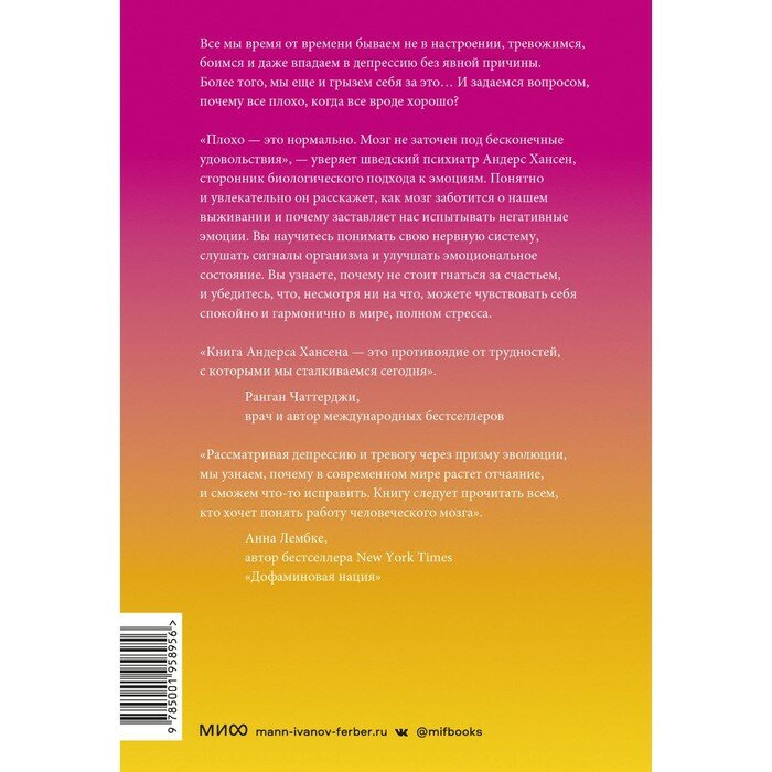 "Плохо - это нормально. Мозг не заточен под бесконечные удовольствия" - уверяет шведский психиатр Андерс Хансен, сторонник биологического подхода к эмоциям. Понятно и увлекательно он расскажет, как мозг заботится о нашем выживании и почему заставляет нас испытывать негативные эмоции. Вы научитесь понимать свою нервную систему, слушать сигналы организма и улучшать эмоциональное состояние. Вы узнаете, почему не стоит гнаться за счастьем и убедитесь, что несмотря ни на что, можете чувствовать себя спокойно и гармонично в мире, полном стресса.