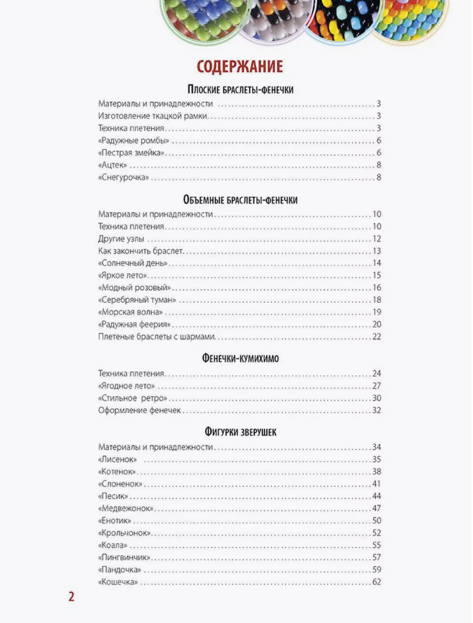 Мне понравилась книга. Она не очень обьемная, но в ней даны классные схемы. Поэтапно от широких браслетов до милых малышей зверушек. Удобные и понятные схемы. Сразу хочу отметить что для новичков такая книга врятли подойдет, так как там нет информации как начать и нет схем простых, тонких фенечек или каких то других изделий, но если уже имеются хотя бы малейшие навыки, то можно смело заказывать и пользоваться.
