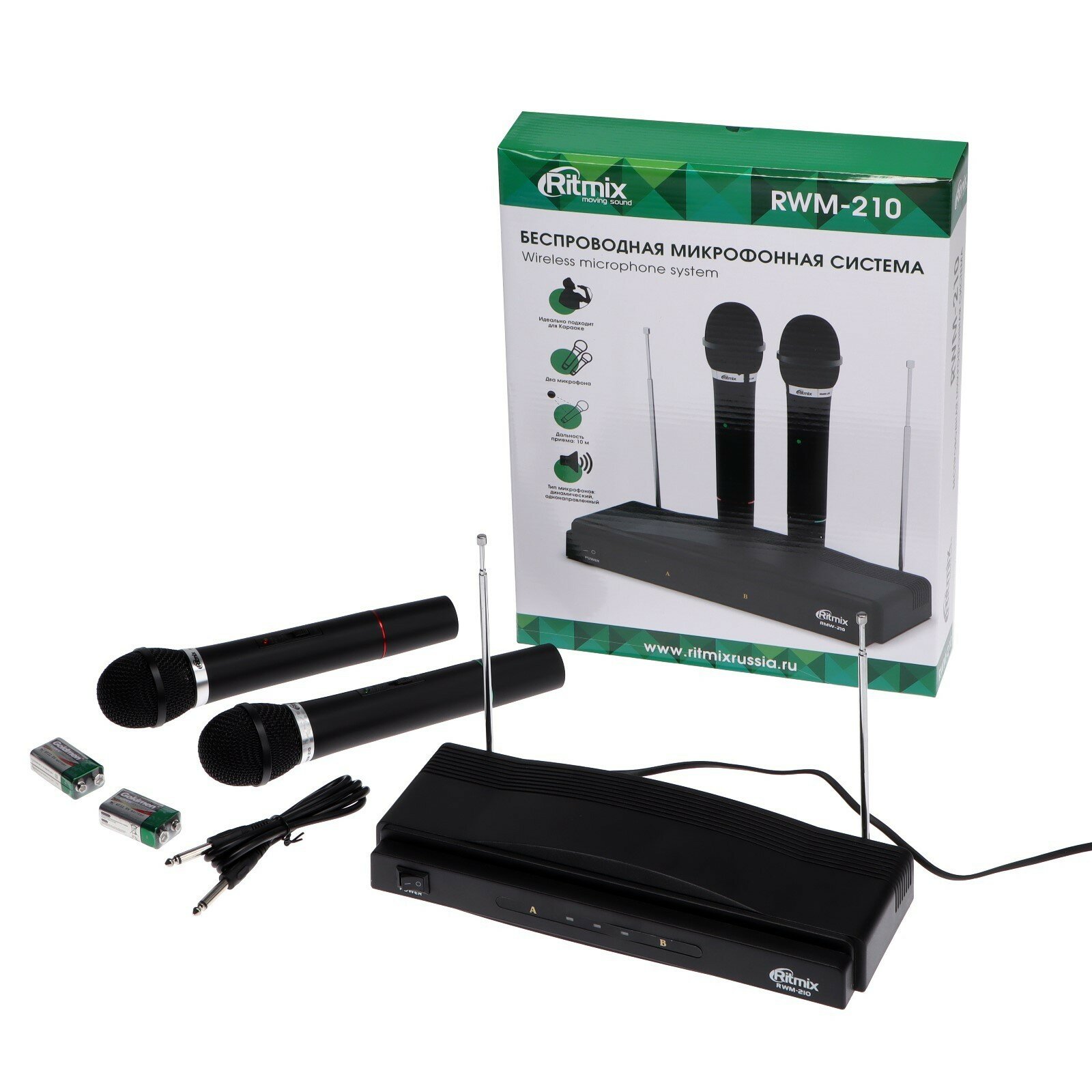 Ritmix - беспроводная микрофонная система. Данное устройство применяется, для вокала, переговоров, лекторами или инструкторами. Кардиоидная направленность не даст попасть в сигнал лишним шумам. Беспроводные микрофоны позволяют свободно перемещаться в небольших помещениях и свободно общаться с оппонентом или аудиторией. Микрофоны держат связь до 30 метров от приемника. работает в VHF-диапазоне на частоте 87,5-82 МГц.