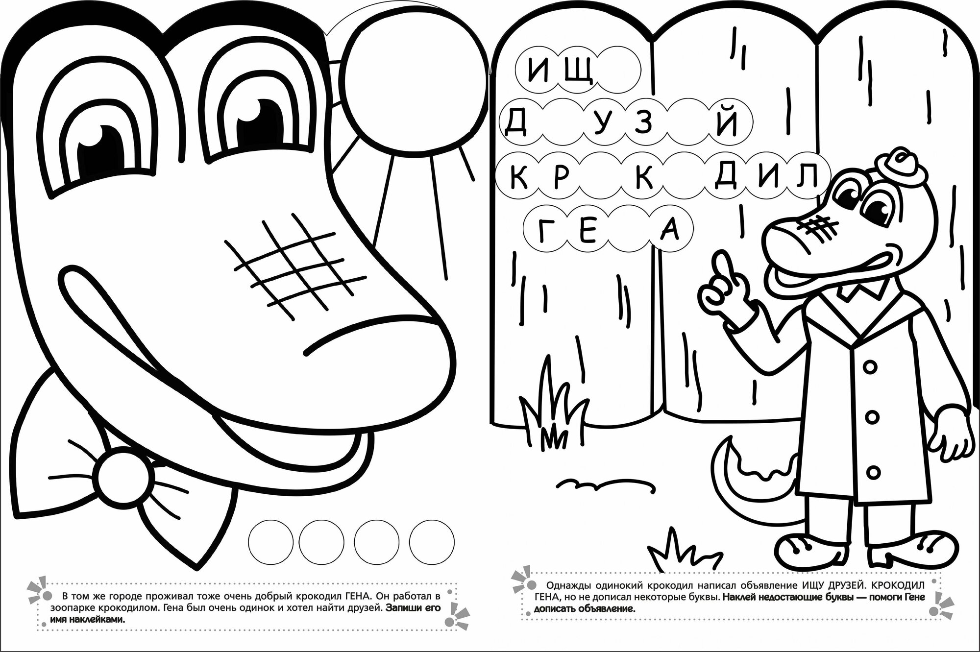 3. Поучаствуй в сказке — дополни картинку наклейками и помоги героям составлять слова из букв.