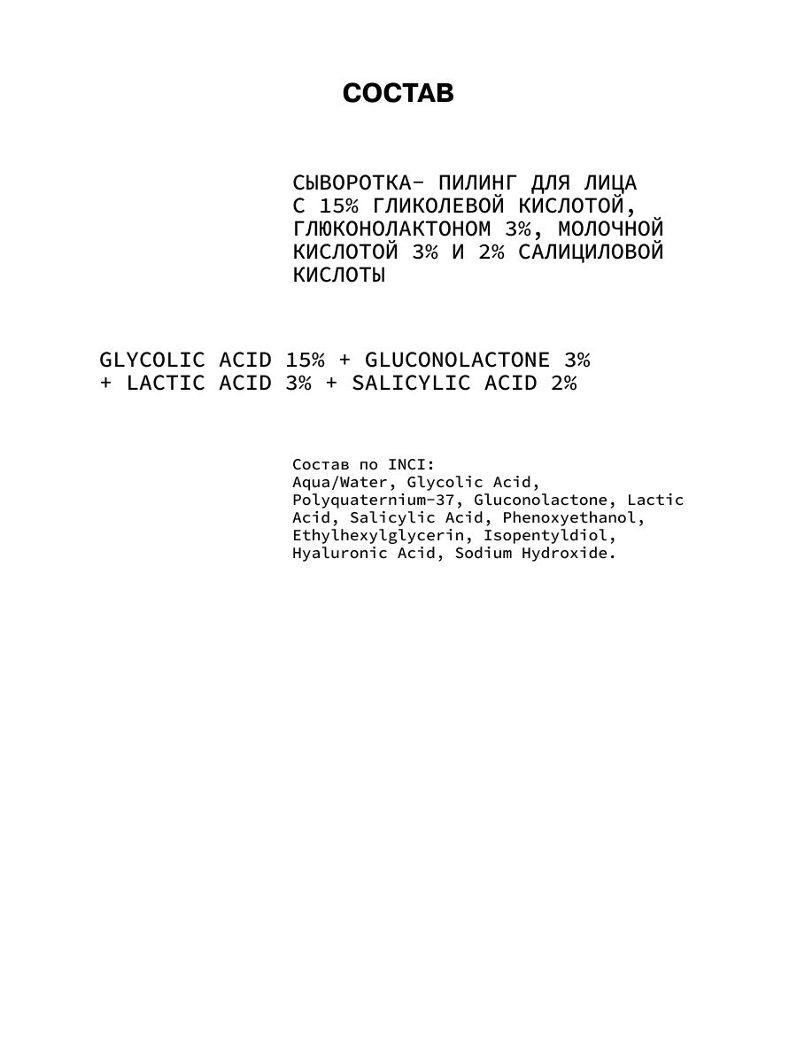 Состав: aqua/water, glycolic acid, polyquaternium-37, gluconolactone, lactic acid, salicylic acid, phenoxyethanol, ethylhexylglycerin, isopentyldiol, hyaluronic acid, sodium hydroxide.