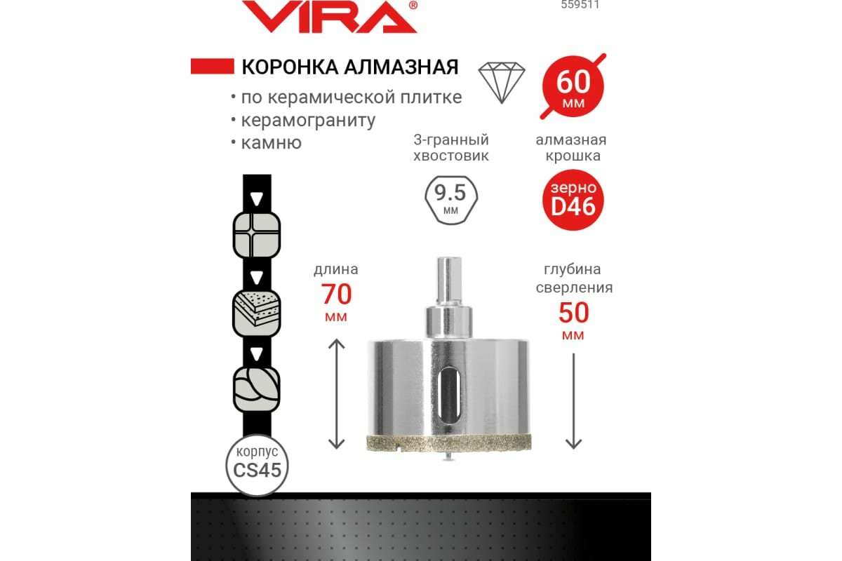 Коронка алмазная по керамограниту и керамике Vira 60 мм Ф60