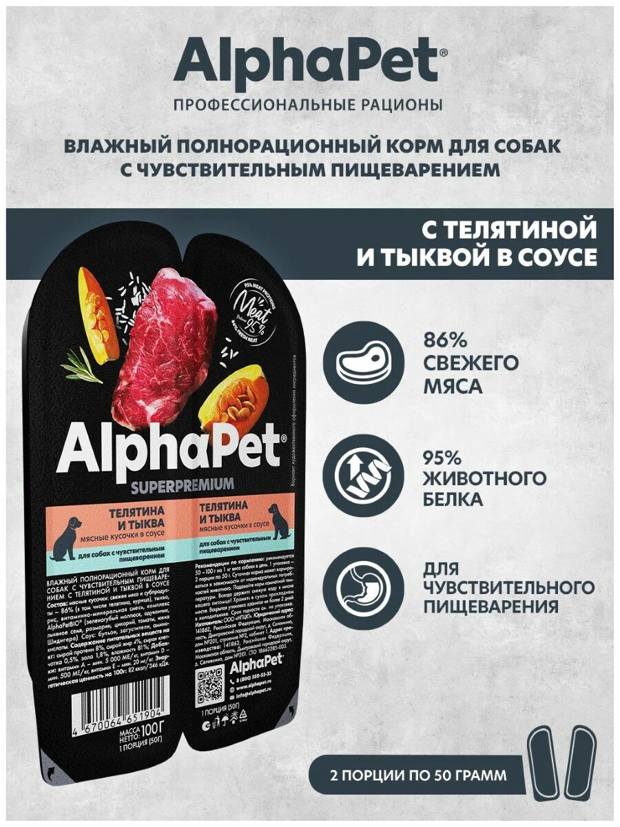 ALPHAPET Adult Sensitive Корм влаж.телятина,тыква д/собак с чувств.пищевар.лам.100г