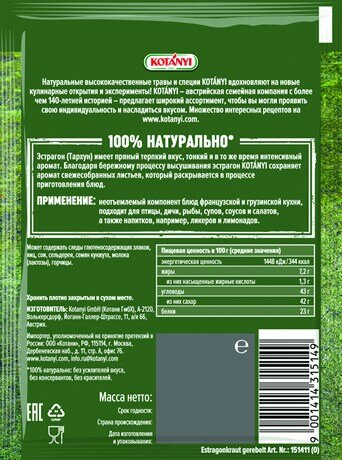 Эстрагон (другое название Тархун) имеет пряный терпкий вкус, тонкий и в то же время интенсивный аромат. Благодаря бережному процессу высушивания эстрагон KOTNYI сохраняет аромат свежесобранных листьев, который раскрывается в процессе приготовления блюд. Применение: неотъемлемый компонент блюд французской и грузинской кухни, подходит для птицы, дичи, рыбы, супов, соусов и салатов, а также напитков (например, ликеров и лимонадов).