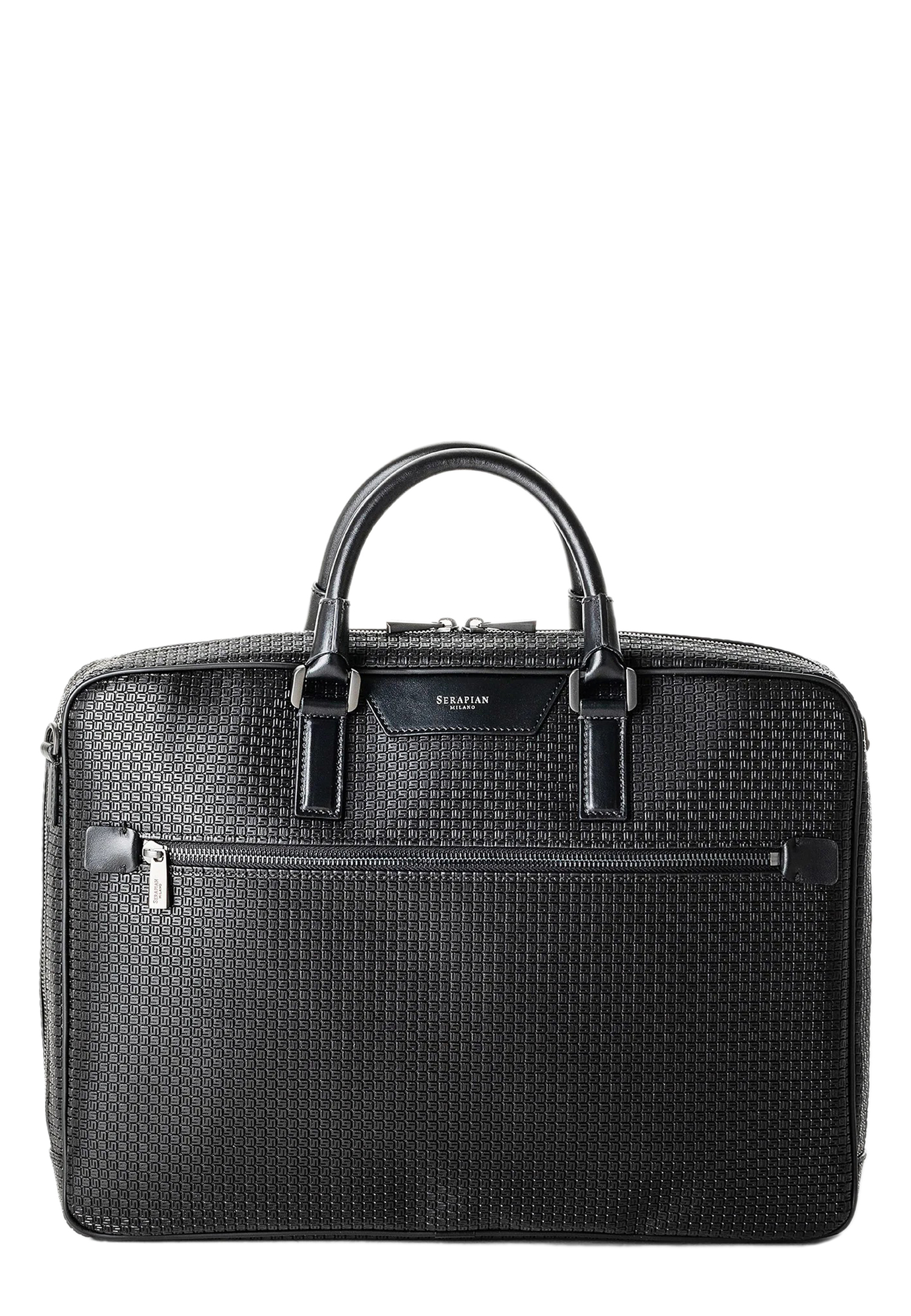 Драгоценные материалы, текстуры ручной работы и совершенство Made in Italy— мгновенно узнаваемые отличительные черты Serapian, которые рассказывают уникальную историю и бросают вызов времени. Частью новой коллекции стал портфель Slim из канваса с покрытием Stepan Black и кожаными вставками Eclipse Black. Холст с покрытием Stepan, прочный и водостойкий материал с S-образной гравировкой по всей поверхности, создан Ардавастом Серапьяном в середине семидесятых годов и до сих пор является эмблемой дома. Внутри одно отделение с карманом для ноутбука, два кармана для смартфона, внутренний карман, три держателя для ручек, карман на молнии.