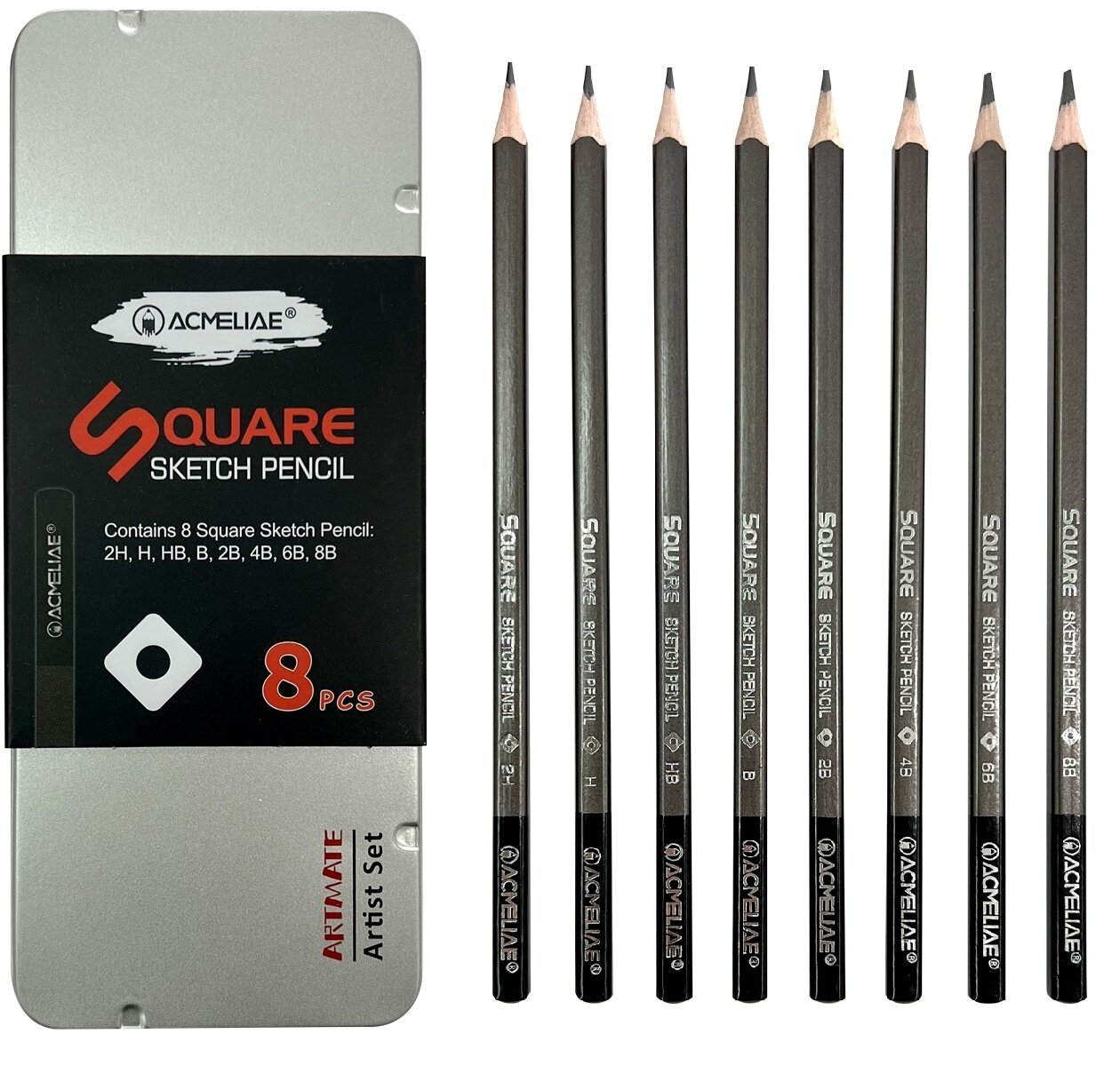 Набор чернографитных карандашей, квадратных Acmeliae 8 твердостей (2H,H,HB,B,2B,4B,6B,8B) в металле