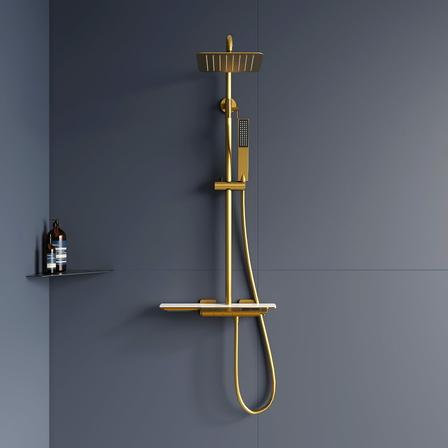 В комплект поставки входит: Смеситель. Душевая штанга. Верхний душ. Ручной душ. Душевой шланг. Держатель ручного душа.