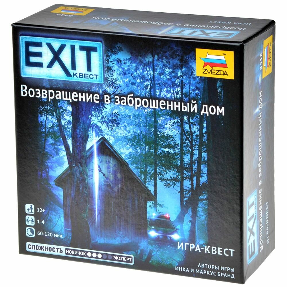 Пожалуй лучше в квартире “Проклятый дом”,“Немой дом”, “Дом ужасов” и еще сотни вариаций названий фильмов ужасов, главным “героем” в которых является старый особняк с тайной кровавой историей. Смотря такие фильмы один за другим, они перестают пугать, да и, если честно, становится невыносимо скучно, не хватает немного иммерсивности в этом занятии. Есть, конечно, и другой вариант – поискать квесты в реальности с тематикой хорроров, но это ходить куда-то надо, а еще и деньги тратить. Поэтому у нас есть для вас ультимативный вариант! Попробуйте свежую, даже ещё немного теплую и хрустящую, новинку из известной серии “EXIT” - “Exit Квест. Возвращение в заброшенный дом”. Ничего не закончилось, игра только начинается Вот тут-то действительно придется вернуться в таинственный дом, полный опасностей. Повстречаться с уже знакомым доктором Артуром Фунбеком, мастером зловещих загадок. Ну как повстречаться, мы очень надеемся, что вы с ним встретитесь, так как разыскать его – основная цель игры. Уникальные истории в каждой части Напомним, что серия “EXIT” – это настольное воплощение больших квестов в реальности. Необходимо, объединив все силы участников команды, погрузиться в выдуманную историю и решать головоломки, для того чтобы спасти мир. Ну или сделать что-нибудь попроще, но не менее важное! Комплектация