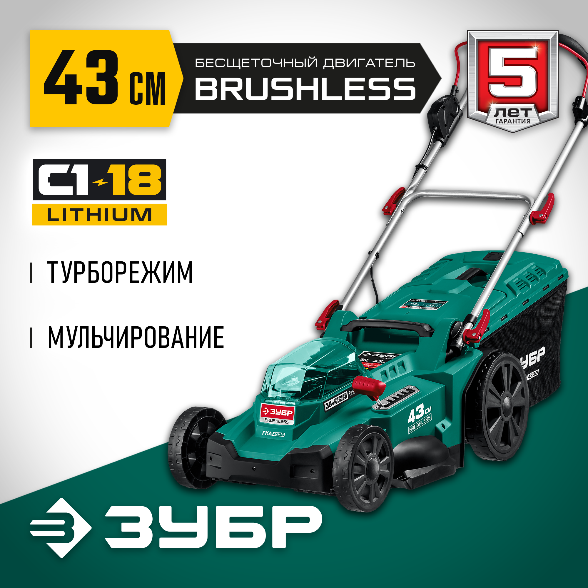 Газонокосилка аккумуляторная Зубр ГКЛ-4336, нож, ширина скашивания 43см, тип выброса травы: в травосборник, четырехколесная