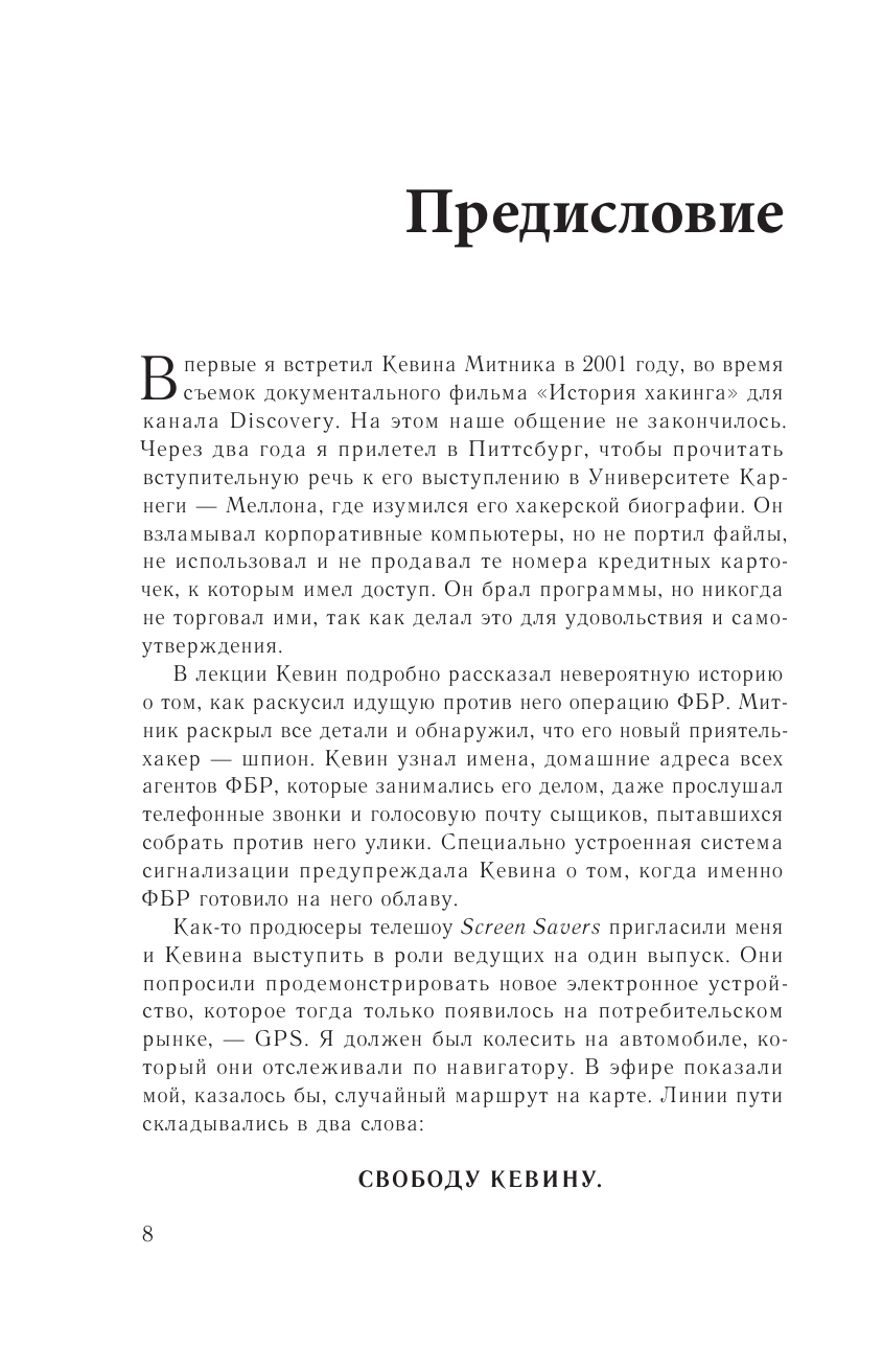 Он долгие годы рыскал по киберпространству, всегда опережая преследователей не на шаг, а на три шага, и заслужил славу человека, которого невозможно остановить. Но для Митника хакерство не сводилось только к технологическим эпизодам — он плел хитроумные сети обмана, проявляя редкое коварство и выпытывая у ничего не подозревающего собеседника ценную информацию.