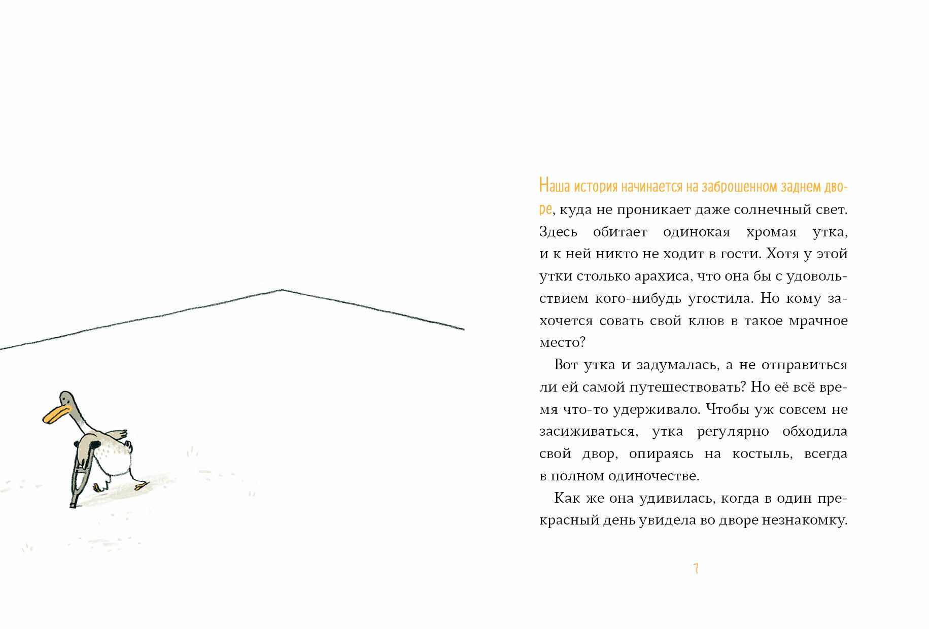 На заднем дворе, куда не проникает солнце, живёт одинокая хромая утка. Ей даже не с кем поделиться арахисом, которого у неё полным-полно! За пределы двора утка никогда не выходила — без костыля далеко не уйти, да и страшно покинуть привычное место, шагнуть в неизвестность и изменить свою жизнь.
