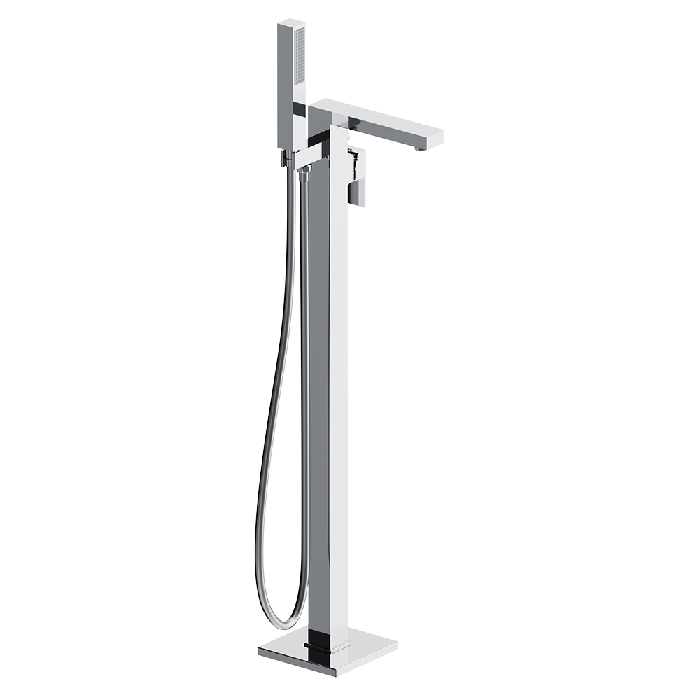 Корпус смесителя 1 шт.; излив 1 шт. ; кронштейн крепления 1 шт. ; комплект крепежный 1 шт. ; рчной душ 1 шт. ; шланг 1 шт. ; гибкая подводка 2 шт. ; декоративная тарелка 1 шт. ; инструкция . Хромированный, высокий отдельностоящий смеситель для отдельностоящей ванны и ручного душа, оригинальный дизайн строгие прямоугольные формы, ручной душ прямоугольной формы, управление одной ручкой