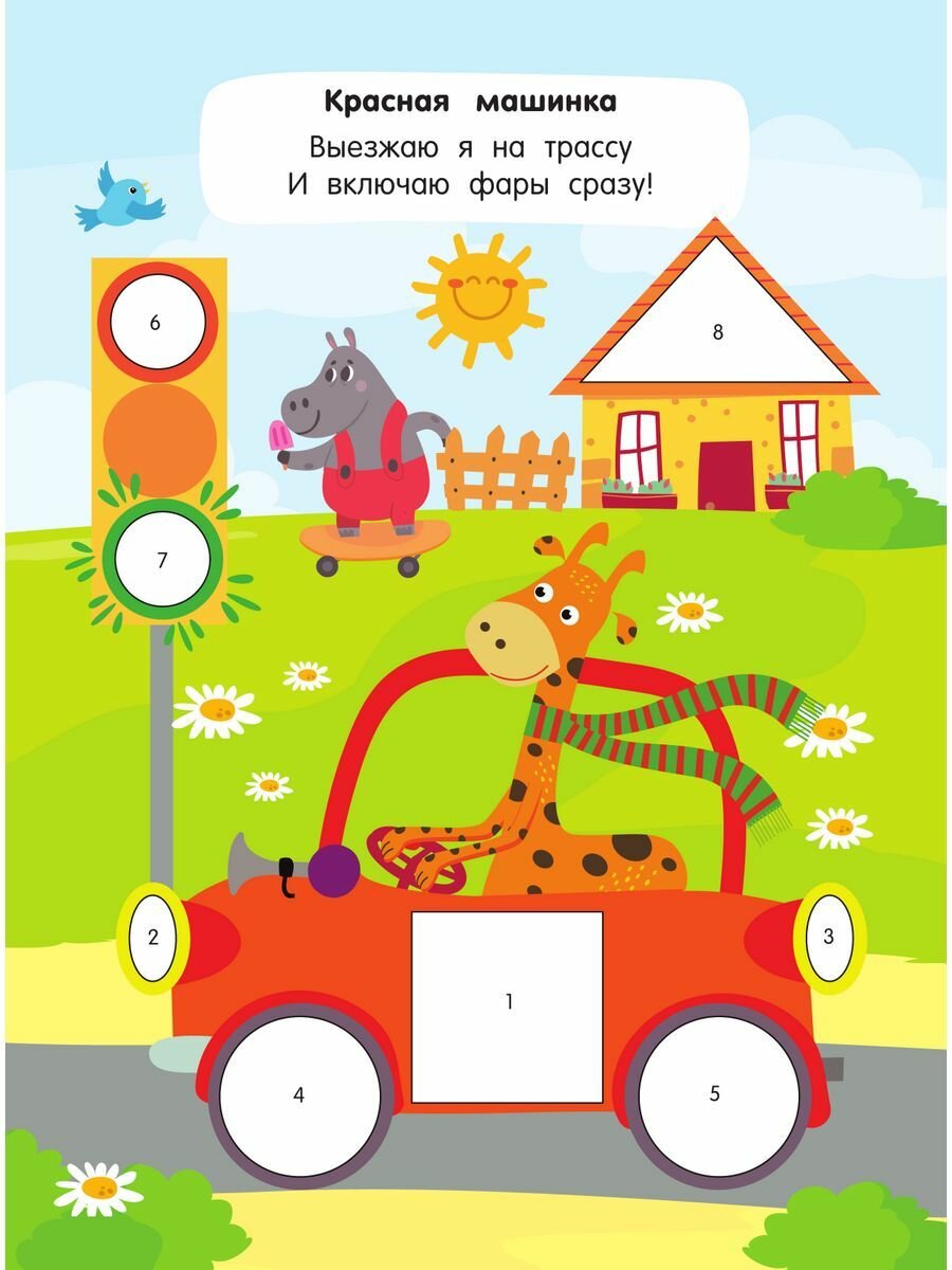 В красочной и милой книге «Паровозики, машинки, кораблики» ребёнок получит всё необходимое для создания яркой аппликации. Никаких ножниц, клея и цветной бумаги! Нужно просто найти наклейку, которая соответствует цифре на картинке. Малыш весело проведёт время, при этом изучая цифры и геометрические фигуры, получая представление о понятиях «больше-меньше», «ближе-дальше», «выше-ниже», развивая мелкую моторику, воображение, внимание и память.