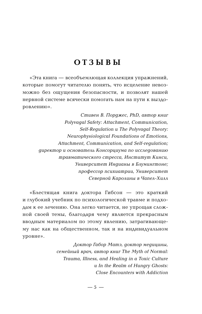 «Травма является первоочередной причиной серьезных проблем со здоровьем во всех возрастных группах. В своей книге доктор Гибсон доступно объясняет все, что нам известно о травме, ее последствиях и способах ее преодоления. Эта книга обязательна к прочтению как для клиницистов, так и для людей, нуждающихся в доступных инструментах безопасной переработки своего собственного травматического опыта». — Катарина Смарт, доктор медицины, врач неотложной помощи, президент Канадской медицинской ассоциации.
