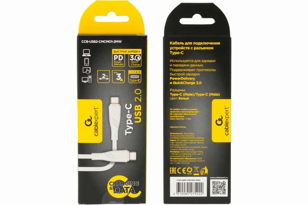 Кабель интерфейсный USB 2.0 Cablexpert Type-C/Type-C, Classic 0.1, 3A, 60Вт, PD/QC3.0, медь, 2м, белый, коробка CCB-USB2-CMCMO1-2MW