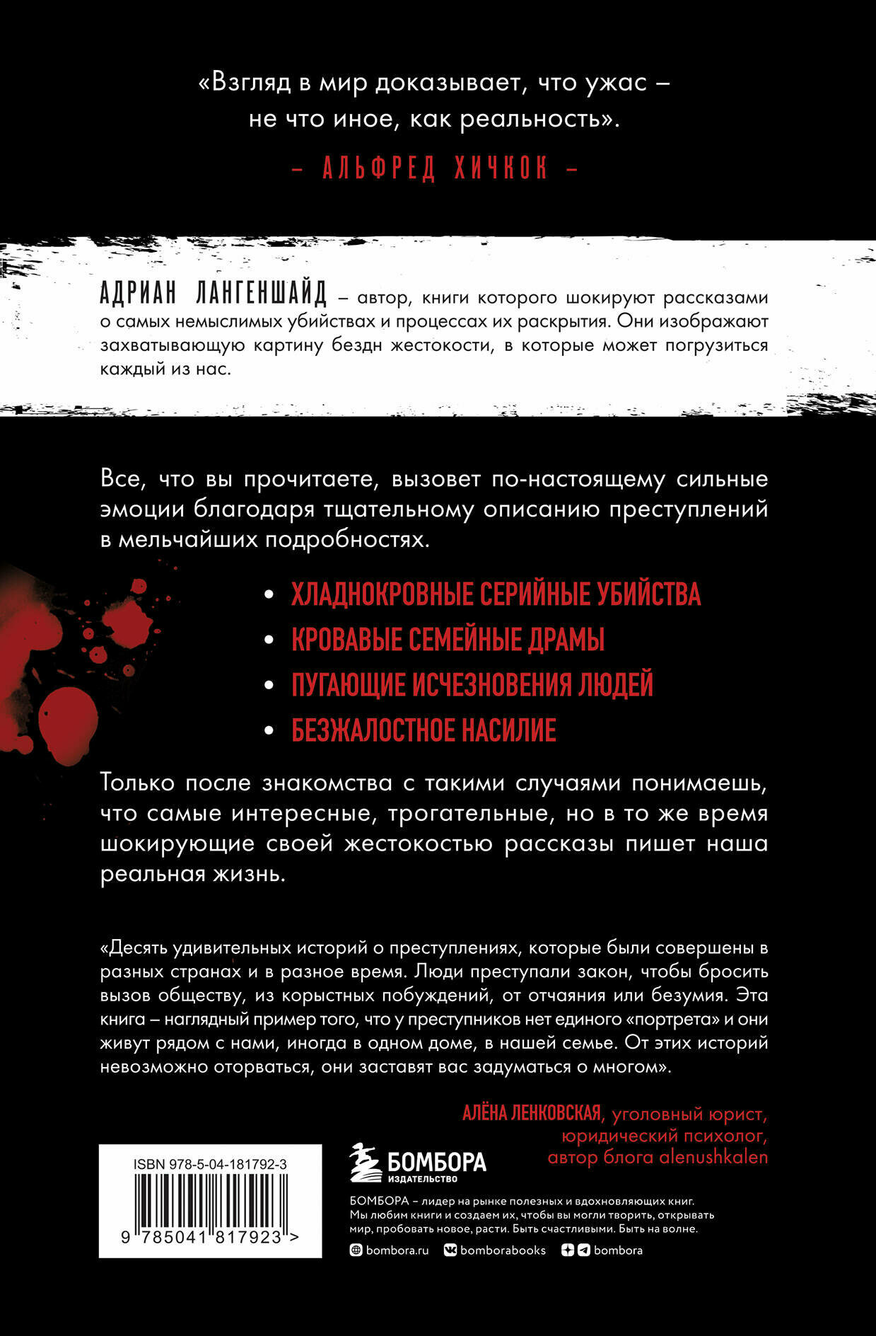 Настоящая жемчужина творчества Адриана Лангеншайда, собравшая в себе 10 его самых невероятных и ярких историй, основанных на реальных уголовных делах. Книга, читая которую, понимаешь, что самые интересные, трогательные, но, в то же время, шокирующие своей жестокостью рассказы пишет реальная жизнь. Вы подвергнете сомнению все, что, как вам кажется, знаете о человеческой природе!