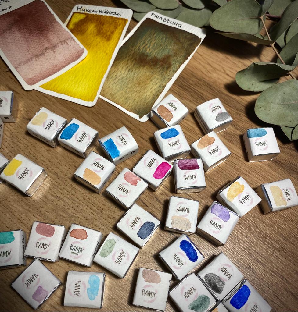Handy watercolor – это художественный эксперимент по поиску новых цветовых решений в акварельной реальности. Автор проекта делает основной упор в палитре на необычные оттенки, в том числе с грануляцией, для создания спецэффектов и неповторимых фактур в акварельных иллюстрациях. Это краски, сделанные вручную в Петербурге из натуральных и синтетических пигментов со всего мира. Они не содержат каких-либо наполнителей, только чистые пигменты. В качестве связующего используется чистый гуммиарабик, глицерин, мед, антисептик и бычья желчь. Отлично подойдут как начинающим художникам, так и профессионалам. Серия представлена акварелью в кюветах поштучно и в наборах.