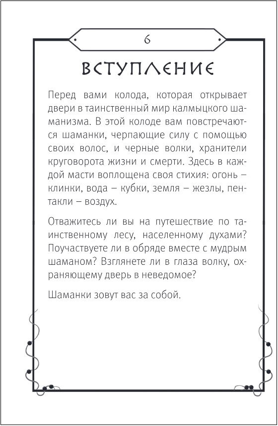Колода карт «Шаманское Таро» сочетает традиции и символизм классической колоды Райдера-Уэйта, калмыцкий шаманский фольклор и авторский стиль художницы Баиры Буваевой. Героями этой колоды стали шаманы и шаманки, духи волшебного леса и волки — хранители врат между реальным и потусторонним миром.