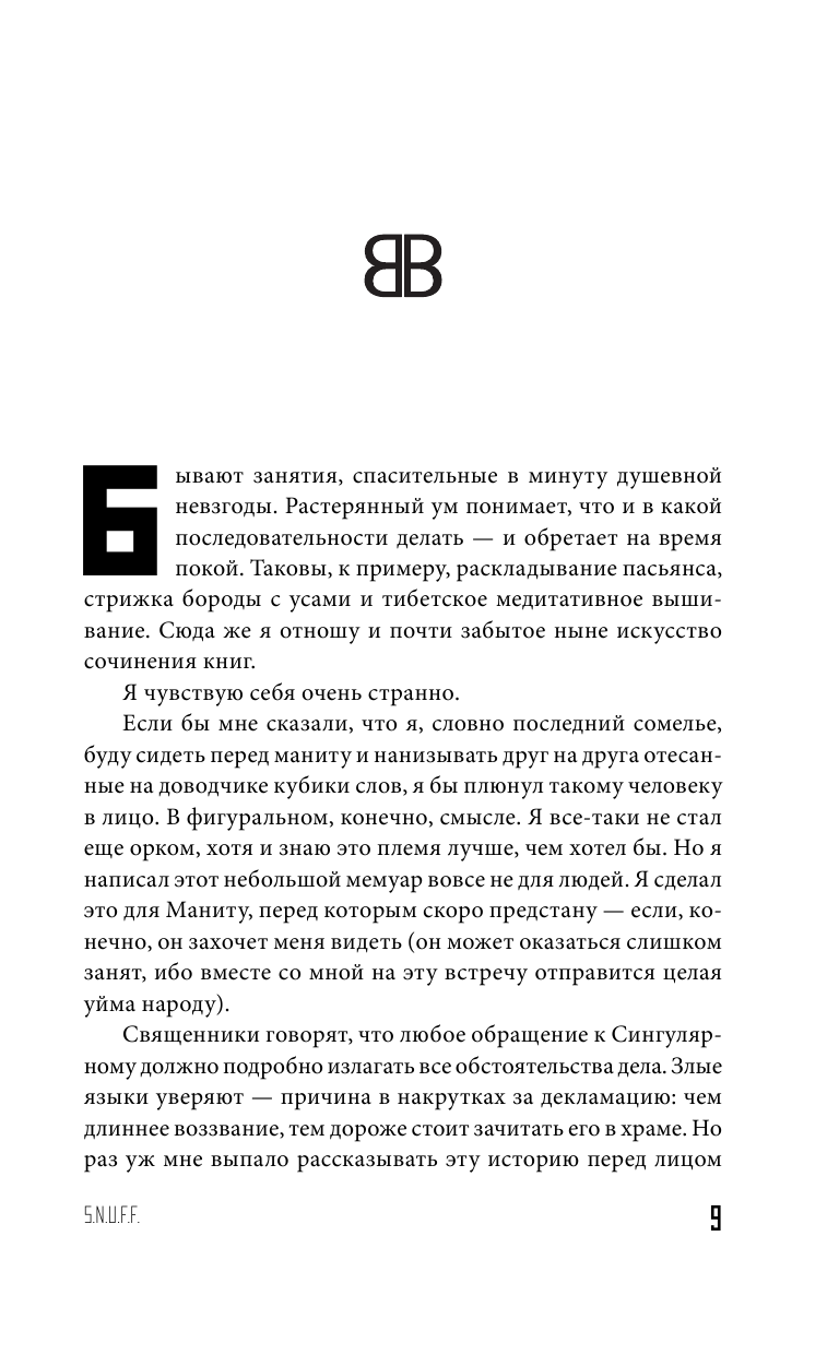Антиутопия, научная фантастика, постмодернизм… Или ужасающий реализм? "S.N.U.F.F." – десятый роман Виктора Пелевина, мастера удивительной прозы. Это многослойное, саркастическое и совсем недоброе повествование о том, куда и к чему движется род людской. Кажется, будто у Пелевина есть возможность время от времени заглядывать одним глазком в будущее – настолько мощен его писательский гений.