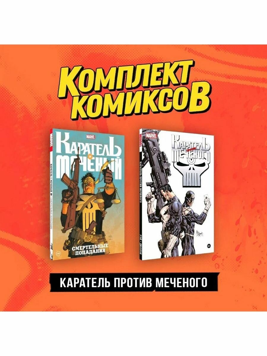 Два столкновения самых непредсказуемых убийц во вселенной Marvel. В комплект входят комиксы "Каратель и Меченый. Смертельные попадания" и "Каратель против Меченого".