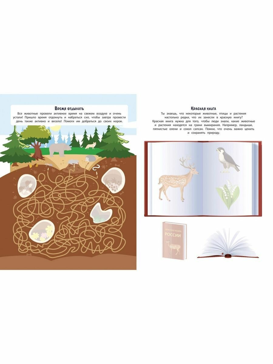 Отправляйся в увлекательное путешествие! Ты узнаешь, какие бывают леса, как называются животные и птицы, которые в них обитают, найдёшь выход из запутанного лабиринта, сыграешь в лесное судоку, а ещё сможешь весело провести время с коллекцией ярких наклеек!