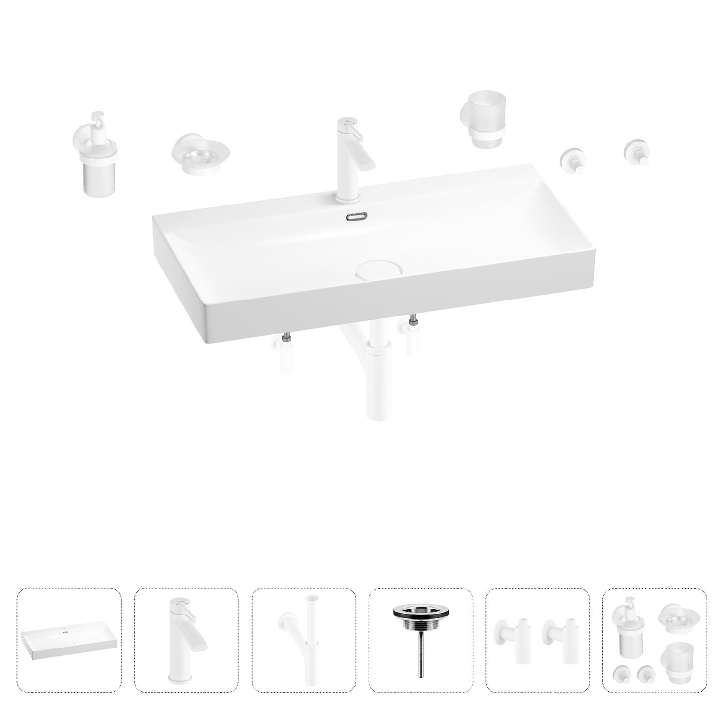 | Дополнительная информация | раковина белого глянцевого цвета, смеситель, сифон, выпуск, угловые вентили, аксессуары (цвет набора матовый белый) |