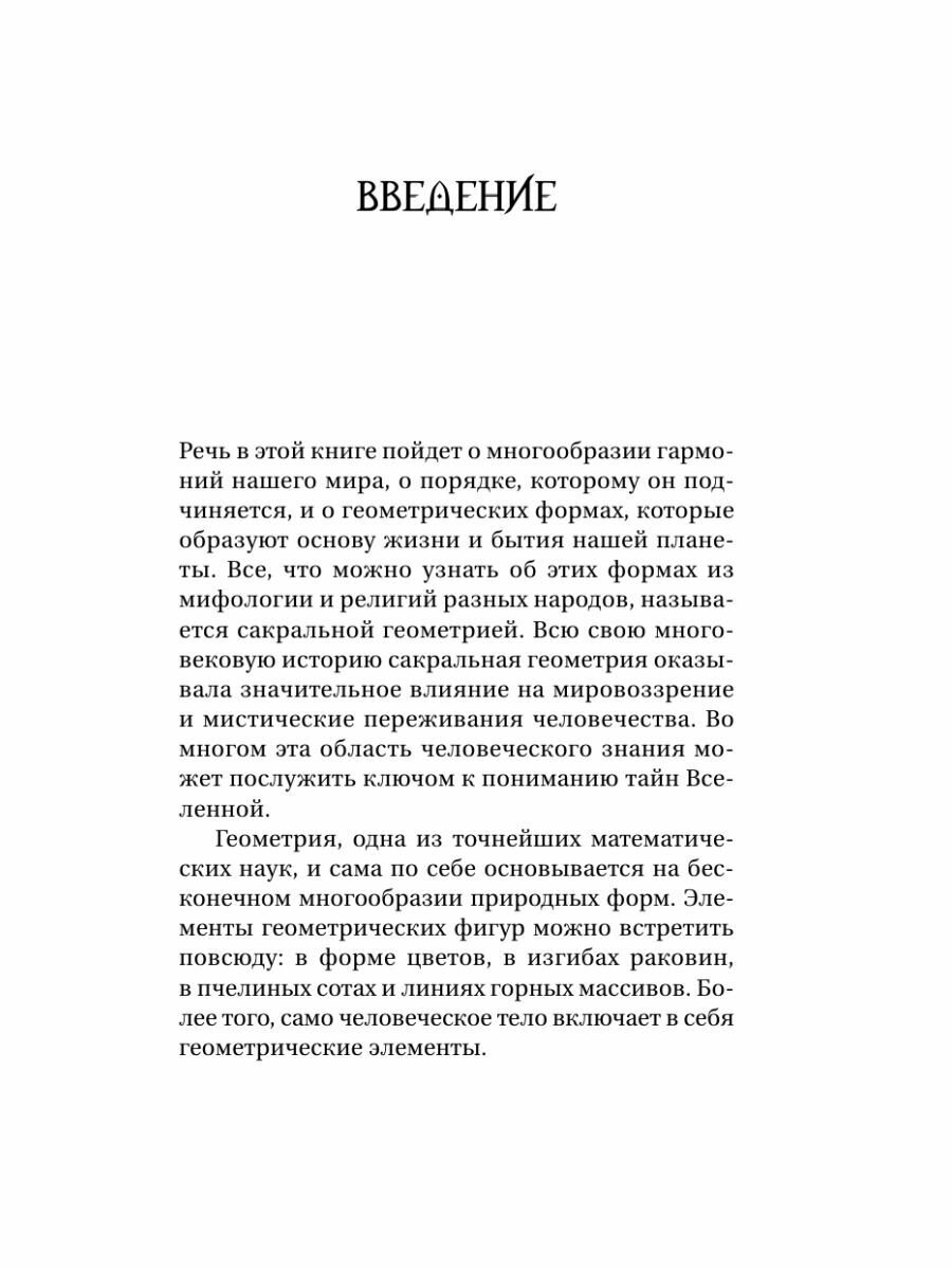 Сакральная геометрия — это древняя система символов и форм, олицетворяющая гармонию и баланс во Вселенной. Она базируется на убеждении, что любая точка, линия или фигура имеет свое собственное значение, свой духовный и философский смысл. Они имеют связь с космическим порядком и влияют на энергию и сознание человека. Сакральная геометрия встречается в различных культурах и религиях, включая египетскую, греческую, индийскую, майя и другие.Эта книга содержит огромный материал о значении фигур и символов, с которыми мы сталкиваемся каждый день, но не понимаем, в чем их суть. Эта книга будет вашим проводником в мир загадок и тайн.Прочитав ее, вы познакомитесь с основными понятиями сакральной геометрии и убедитесь, что она присутствует повсюду в окружающем мире и даже в нас самих. Все во Вселенной — от простейших фигур до полотен гениальных художников прошлого — содержит в себе ключ для разгадки великих тайн мира и человека. Разобравшись в сакральной геометрии, вы не только сможете менять внутреннее и внешнее пространство, но и научитесь создавать собственный мир в соответствии со своими собственными желаниями, используя энергию сакральных элементов.