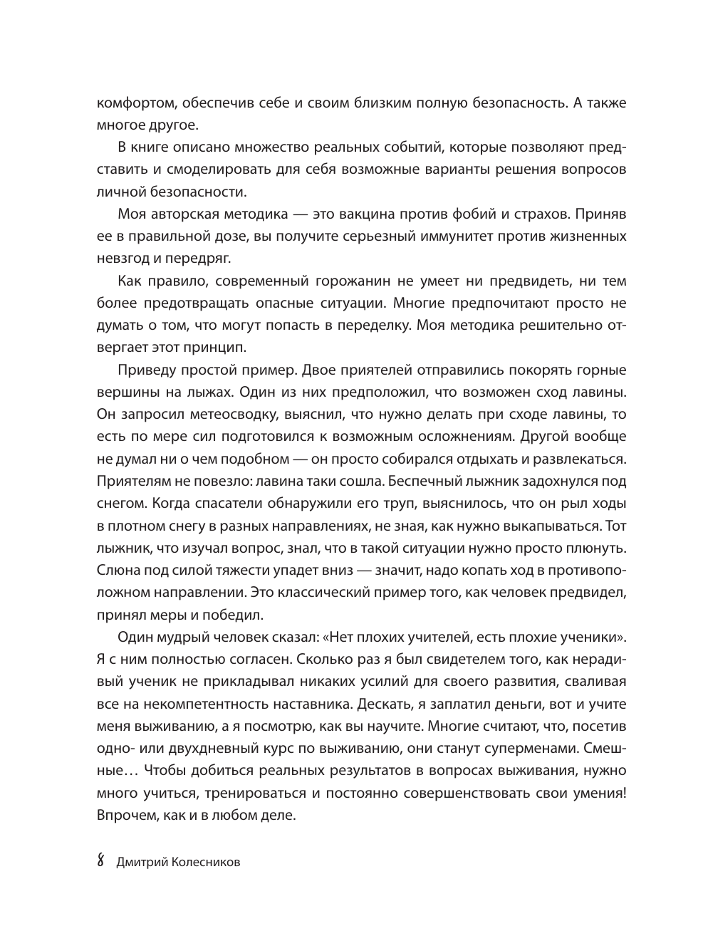 Что делать, если вы вдруг заблудились в лесу или по стечению невероятных обстоятельств оказались ночью в дикой природе без палатки, спальника, теплой одежды и еды? Многие из нас не умеют ни предвидеть, ни тем более предотвращать опасные ситуации. Некоторые предпочитают просто не думать о том, что могут попасть в переделку. Основная часть знаний, которыми пользуется современный человек, — это опыт предков. Выживание — один из самых сильных инстинктов, присущих живым существам. Эти инстинкты надо пробуждать и развивать их в нужном направлении. Автор книги — специалист по безопасности и выживанию в дикой природе, президент «Академии выживаниЯ», руководитель отделения рукопашного боя и акробатики российского центра каскадеров «Трюк», телеведущий. На многолетнем опыте выстроил методику самосохранения, которая позволит смоделировать возможные варианты решения вопросов личной безопасности. Благодаря этой книге вы узнаете: - как развести огонь, добыть воду, обустроить место для ночлега и провести ночь в лесу с максимальным комфортом, обеспечив себе и своим близким полную безопасность; - как оказать первую доврачебную помощи при переломах, открытых ранах, отравлениях и укусах насекомых и змей; - как правильно сориентироваться на местности и какими способами подавать сигналы бедствия; - что делать при наводнениях, землетрясении, лесных пожарах и приближающейся грозе.