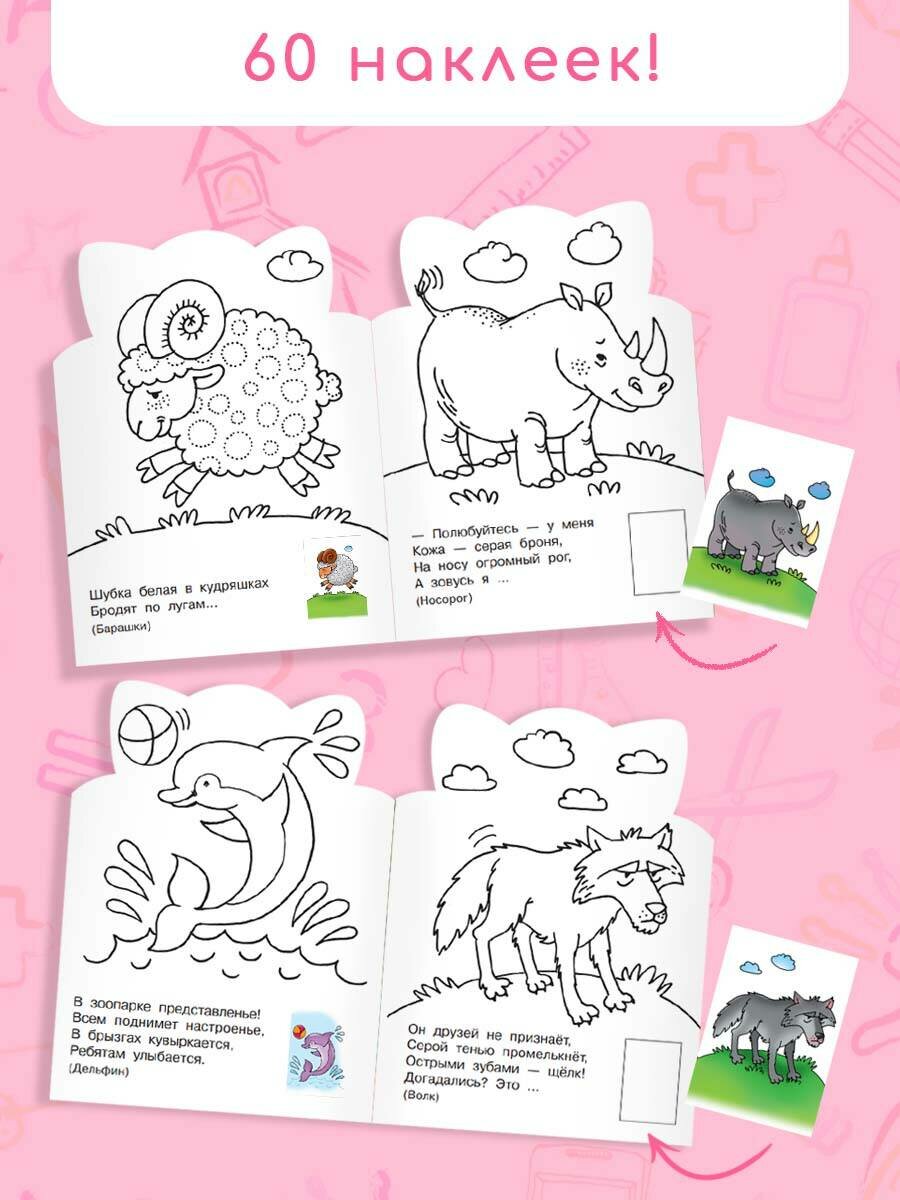 «Зверята» — замечательная книжка с наклейками и фигурной вырубкой, которая поможет вам и вашему ребенку интересно и с пользой провести свободное время. Внутри обучающая раскраска + коллекция из красочных стикеров для знакомства со зверятами. Юного художника ждут крупные картинки с чётким контуром, красочные стикеры с животными. Благодаря плотной бумаге дети могут использовать различные материалы для рисования: карандаши, маркеры, краски или мелки. С первых мгновений ребёнок погрузится в процесс и уже не сможет оторваться от увлекательного мира творчества!Замечательная раскраска с фигурной вырубкой — это забавные картинки животных и коллекция чудесных красочных наклеек. Играя с книжкой «Зверята», ребёнок раскрашивает картинки, с удовольствием отгадывает загадки и подбирает подходящие наклейки. Интересные занятия развивают воображение, мелкую моторику рук, логическое и абстрактное мышление, память и речь. Раскрашивать забавные картинки на плотной белой бумаге можно цветными карандашами, карандашами, фломастерами, мелками, красками. Для дошкольного возраста.