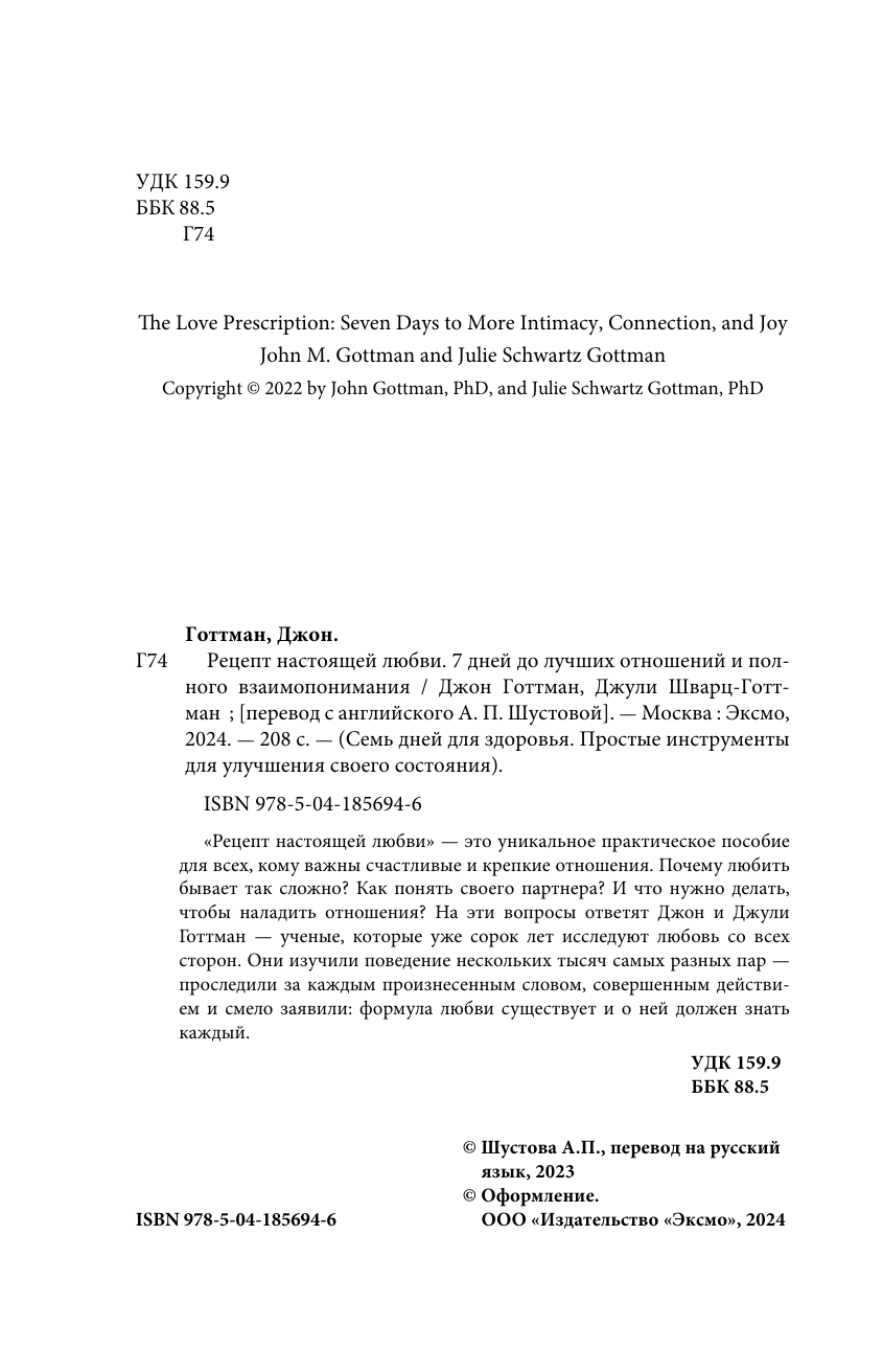 "Единственное, что действительно предвещает конец отношений - это если вы оба уже сдались. Но если вы держите в руках эту книгу, значит, это не так", - пишут авторы этой книги. Джон и Джулия Готтманы - доктора философии, практикующие психологи, преподаватели и авторы популярных книг. Обладатели премий и наград за достижения в области психологии. Вместе они создали "лабораторию любви" при Институте Готтмана, где уже сорок лет наблюдают за поведением тысяч влюбленных пар и помогают им наладить семейную жизнь. Какой будет совместная жизнь? Как сохранить чувства? Что делать, если вы совсем не понимаете друг друга? Готтманы разложили любовь на составляющие и выяснили, из чего складываются крепкие и счастливые отношения. Они вывели универсальные правила, которые неизбежно приведут к теплым чувствам, и предложили простую, но действенную формулу счастливых отношений. Книга "Рецепт настоящей любви" поможет вам сделать семь шагов навстречу друг другу. "Дорожная карта к лучшим отношениям. Авторы разработали простые практики, призванные научить партнеров общаться друг с другом, слышать, уважать и понимать. Перед вами теплая поддержка для исцеления проблемных отношений". - Kirkus Reviews "Объединив десятилетия исследований в семь простых стратегий, эта книга может предложить легкое и увлекательное вмешательство в ваши отношения с партнером. В каждой главе представлены упражнения, которые могут помочь на любом этапе. Независимо от того, насколько мы заняты, у нас действительно достаточно времени, чтобы быть добрыми друг к другу". - The New York Times