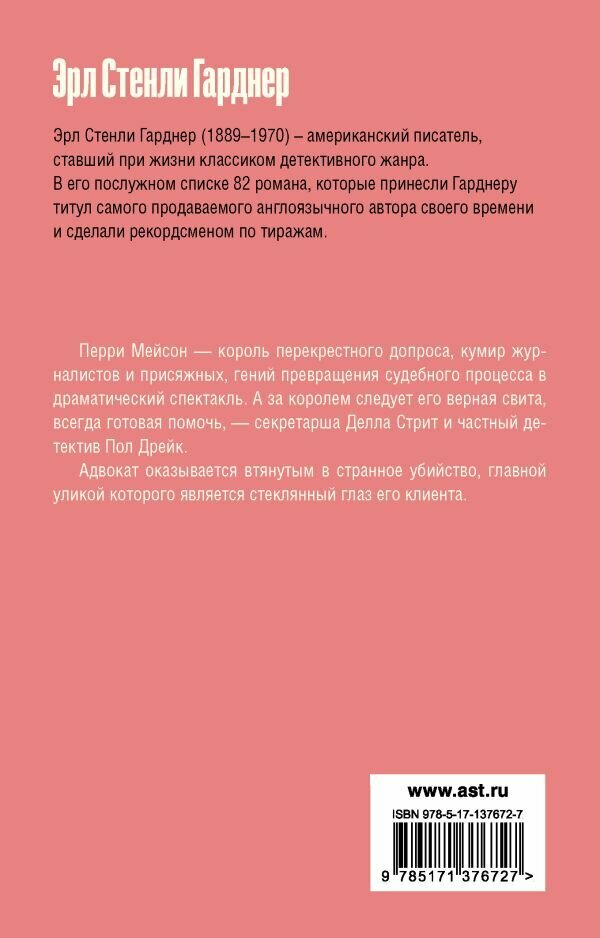 Перри Мейсон — король перекрестного допроса, кумир журналистов и присяжных, гений превращения судебного процесса в драматический спектакль. А за королем следует его верная свита, всегда готовая помочь, — секретарша Делла Стрит и частный детектив Пол Дрейк. Адвокат оказывается втянутым в странное убийство, главной уликой которого является стеклянный глаз клиента Мейсона.