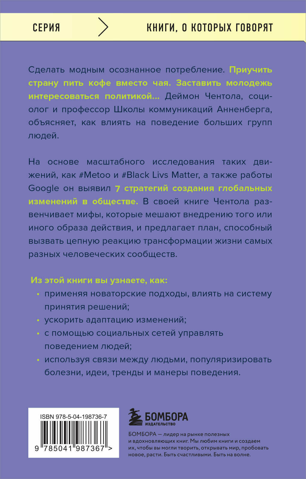 На основе масштабного исследования таких движений, как #Metoo и #Black Livs Matter, а также работы Google, он выявил 7 стратегий создания глобальных изменений в обществе. В своей книге Чентола развенчивает мифы, которые мешают внедрению того или иного образа действия и предлагает план, способный вызвать цепную реакцию трансформации жизни самых разных человеческих сообществ.