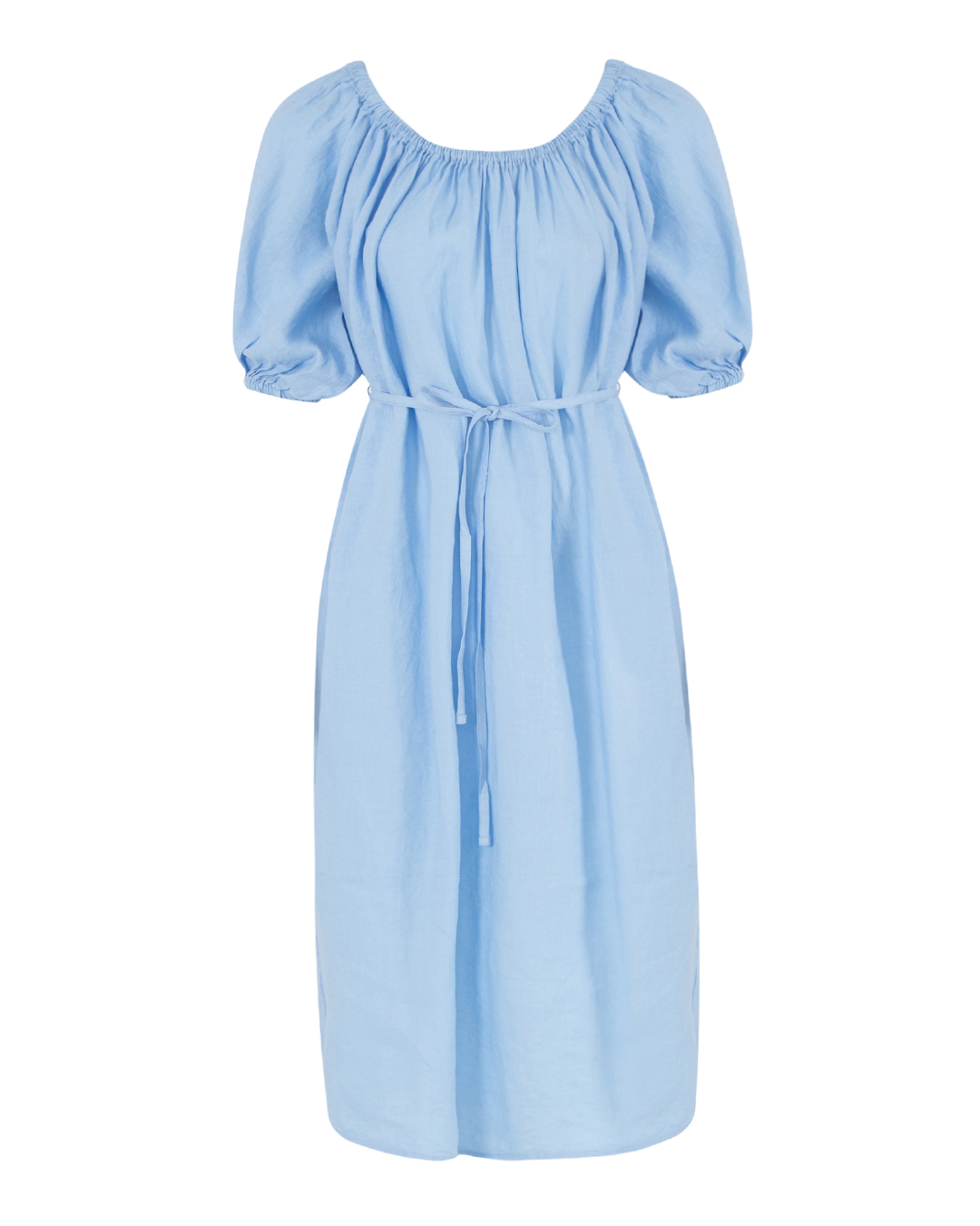 Платье ANTELOPE THE LABEL сшито из натурального льна. Модель длины миди с пышными короткими рукавами и завязками по линии талии.