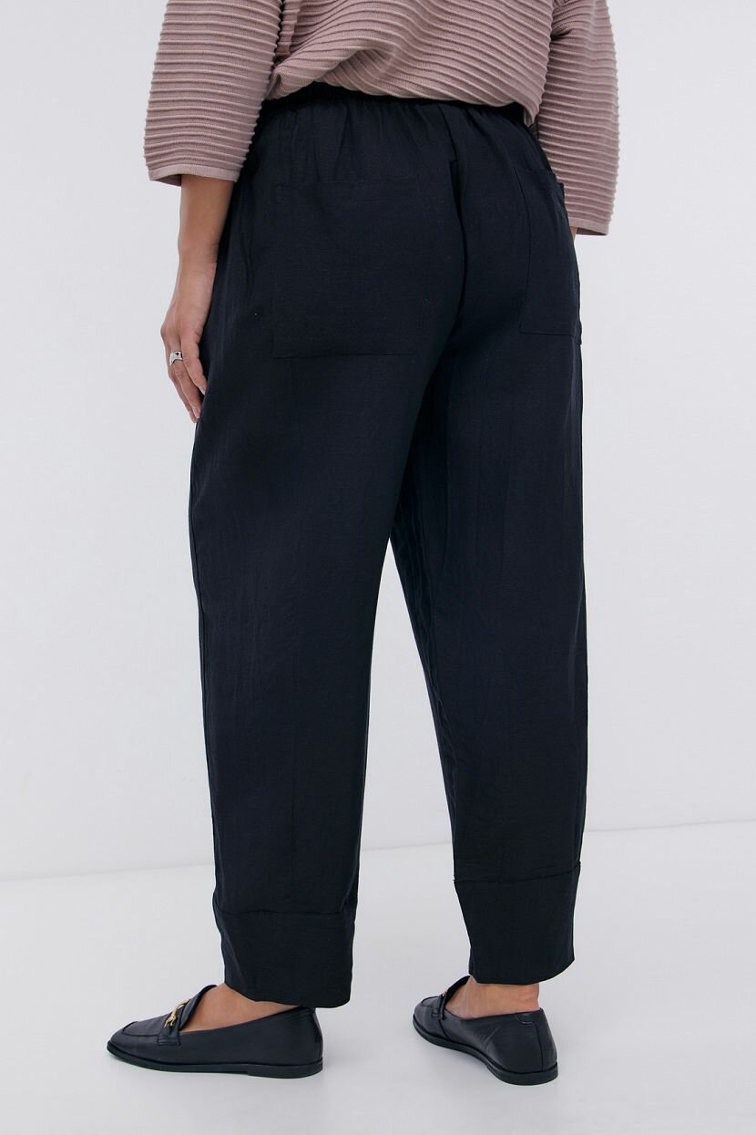 Лёгкие брюки-бананы станут комфортным выбором для жаркой погоды. Модель без застёжки имеет широкий эластичный пояс, который мягко садится по фигуре и подстраивается под её особенности. Нижние части штанин завершаются пришивными манжетами, благодаря чему брюки хорошо удерживают форму. Продольные рельефные швы визуально вытягивают фигуру. Брюки дополнены двумя накладными карманами сзади.Модель выполнена из полностью натурального полотна. Лён и вискоза обладают дышащим и гипоаллергенным эффектом, а также придают материалу выразительную фактуру. Натуральные ингредиенты обеспечат комфортное отведение влаги с поверхности кожи и подарят ощущение прохлады. Обратите внимание: натуральные волокна могут дать усадку при стирке, поэтому стирайте брюки в прохладной воде.